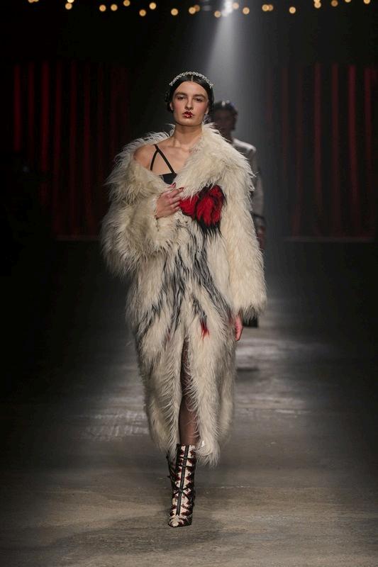 This second look was only the beginning. The fourth model, also smoking, wore an intricately crafted lace dress with a nostalgic headscarf that seemed to reference traditional bridal looks Yet a dramatic leather coat completed the ensemble, adding a distinctive urban edge with an irreverent (and very Kate Moss-like) smirk Marchi’s protagonist is a girl who holds all the cards: uncontrollable yet in control, she likes to toy with the world on a string and laugh at the results. And she is very much a daughter of that glorious early-2000’s era that immediately predated the advent of cell phones. Marchi united turn-of-the-century glamour with contemporary couture sensibility, proposing oversized fur coats, paired with complex layers, in ivory, leopard print and black She also used fur for ingenious accents, such as exaggerated epaulettes expanding like the wings of an angel or oversized cuffs adding a playful touch to an elegant pink gown