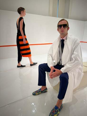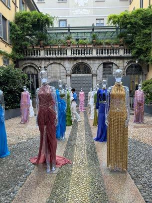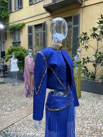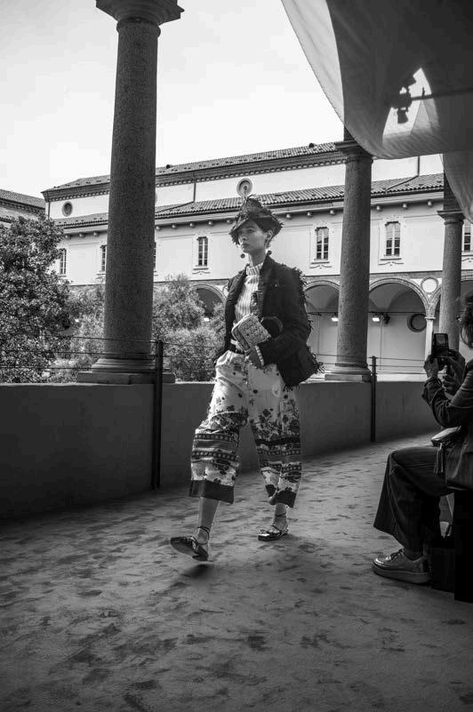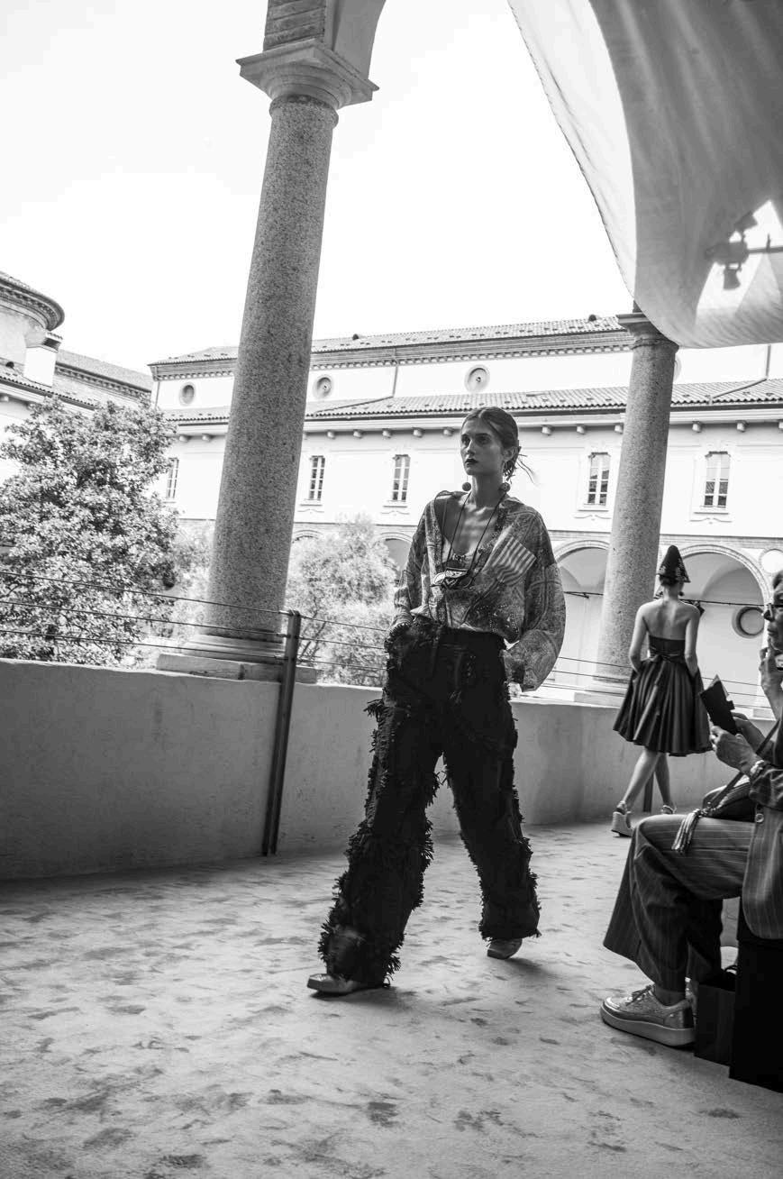 Clean whites and bright colours were at the heart of Mantu’s Spring / Summer 2025 presentation. As we have become accustomed to, the brand transformed its show space into a holistic and fully immersive sartorial universe to launch its new collection. Guests were invited to don gracefully draped robes and sit in a clinically white space to watch a series of models proceed down a runway that seemed at once both retro and futuristic. Elegant anklelength silhouettes were proposed in vibrant shades of leaf green, brilliant blue, and resplendent orange, echoing the rhythm of an Italian summer. Paired with shades of midnight velvet and the occasional whimsical pattern, they encapsulated the light-hearted elegance that makes Mantu a perennial fixture in the contemporary Milanese closet.