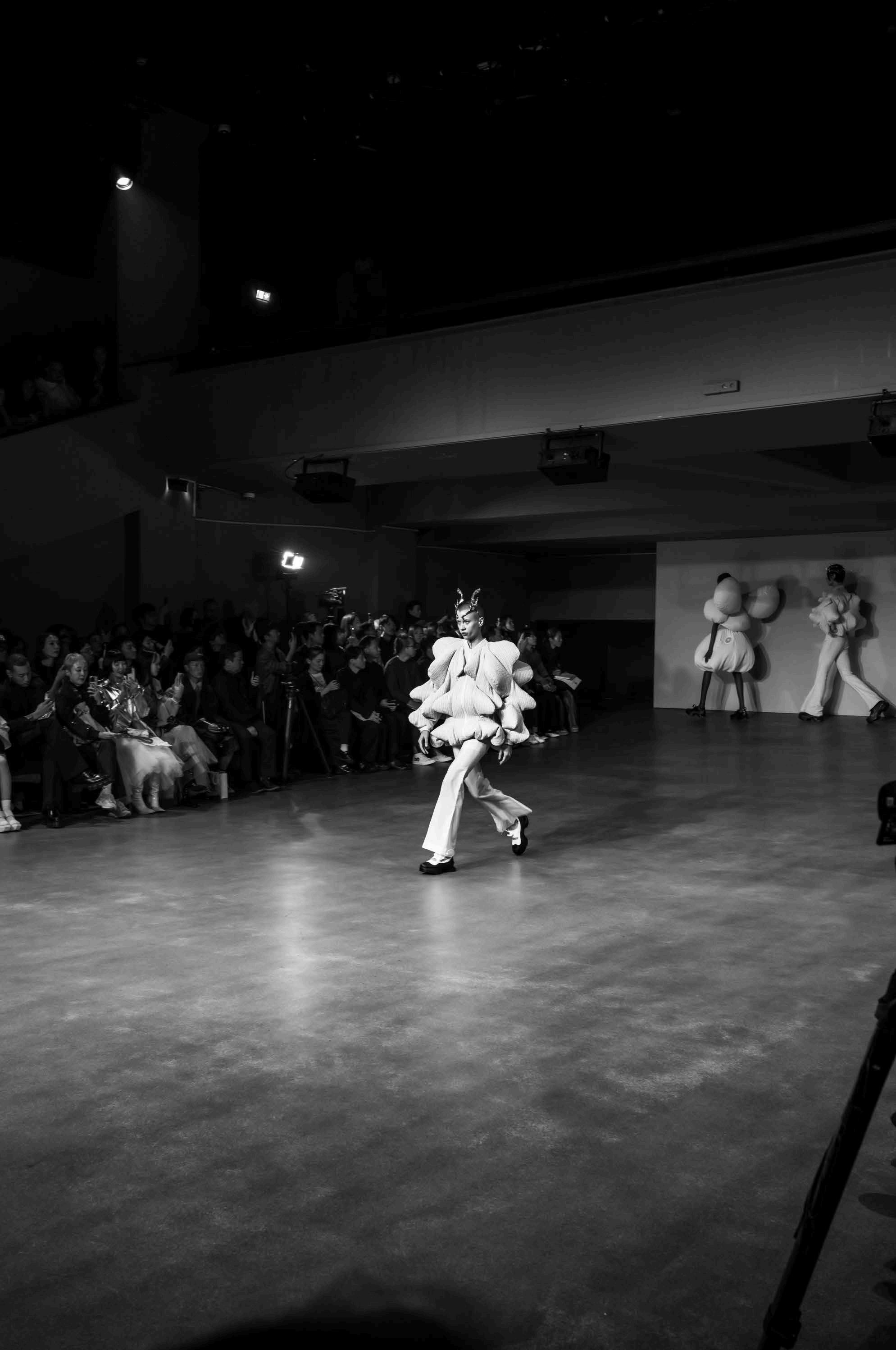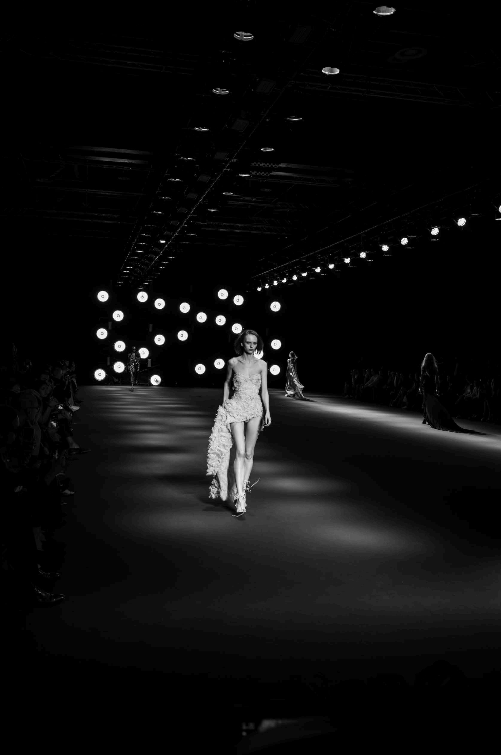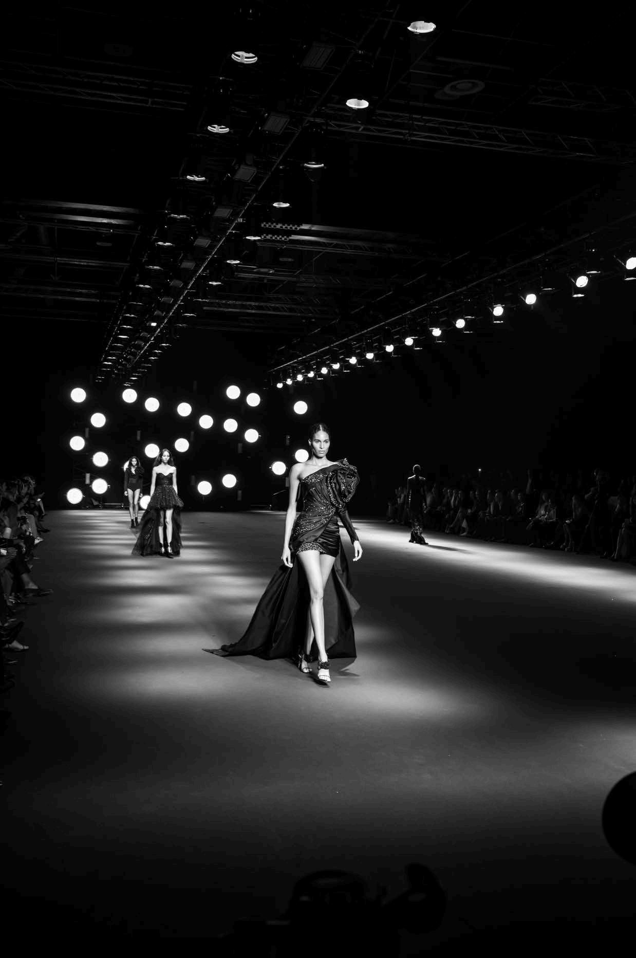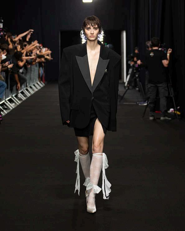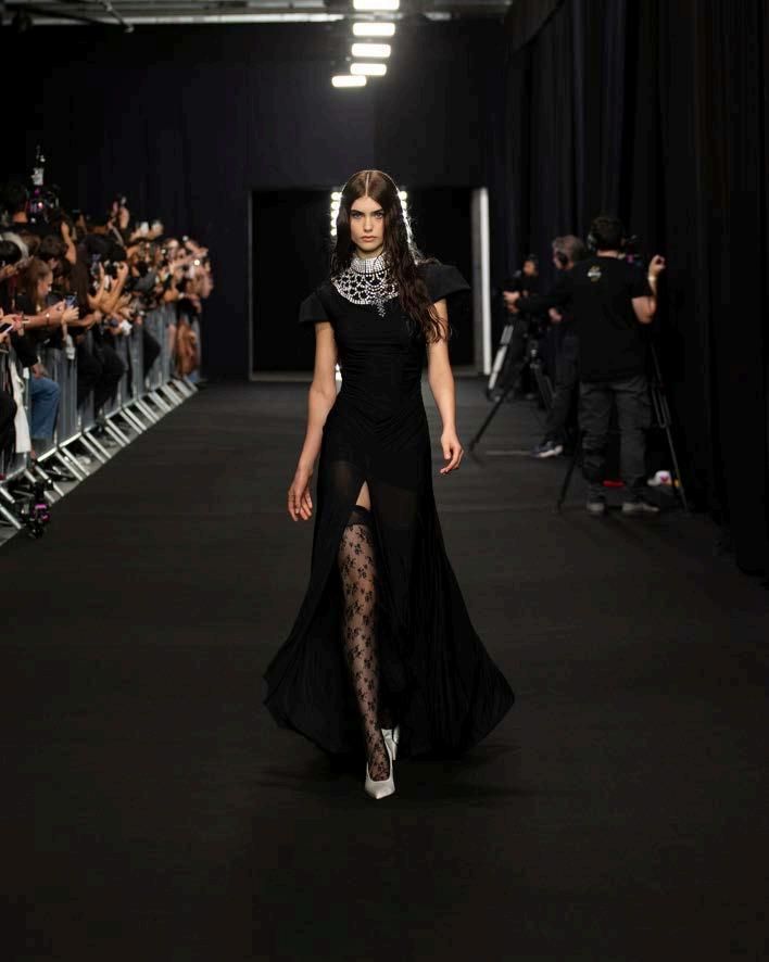 The attention to detail in this collection was truly remarkable. The fluidity of silk, the intricate craftsmanship of embroidery, and the thoughtful layering of textures created a poetic dialogue between fabric and movement. Every ruffle, feather, and shimmering sequin seemed to tell a story, embodying the essence of femininity with a sense of effortless grace.