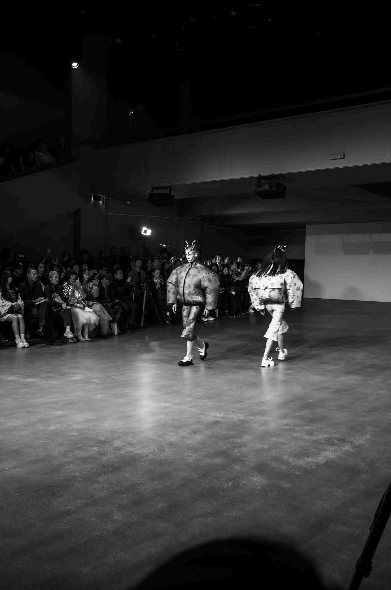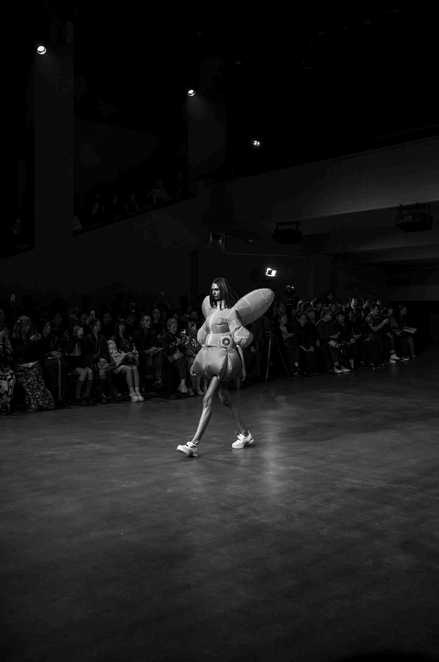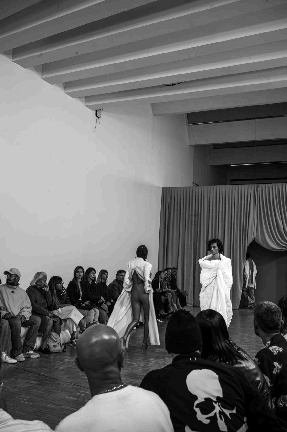 Meanwhile, gasps emerged from the audience when a model in jeans strutted down the runway wrapped in what appeared to be a white duvet (as if on the way from bed to the kitchen for a drink of water on a cold winter’s night). The look immediately recalled a number of iconic moments in recent fashion history.
