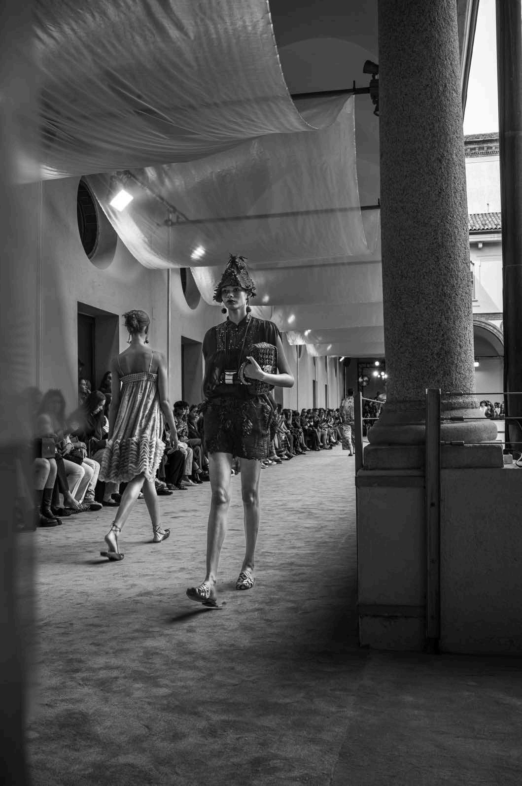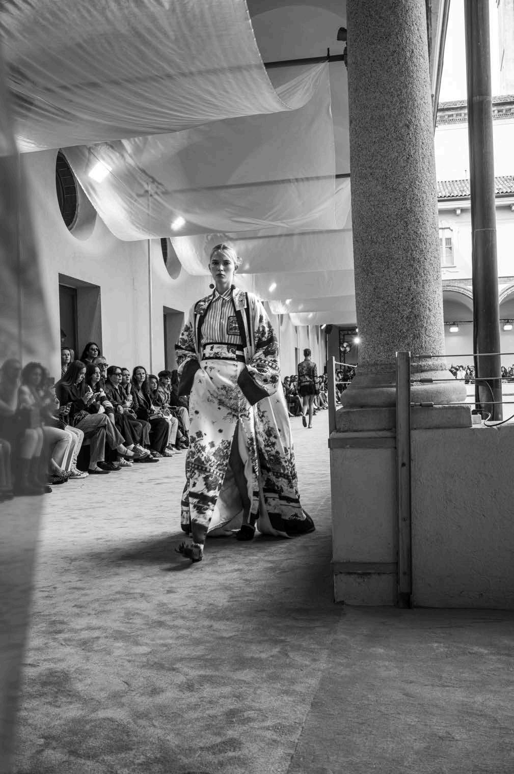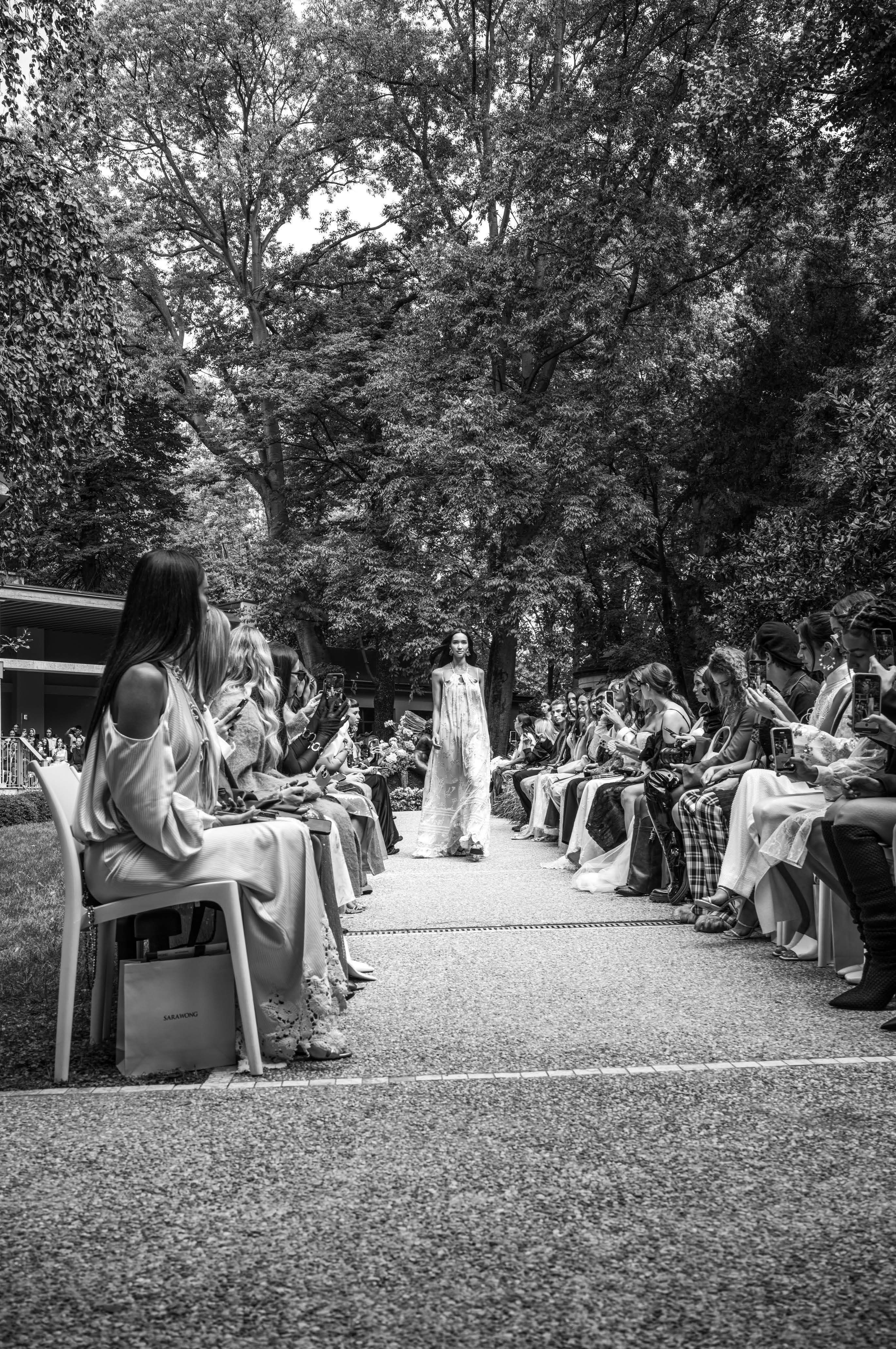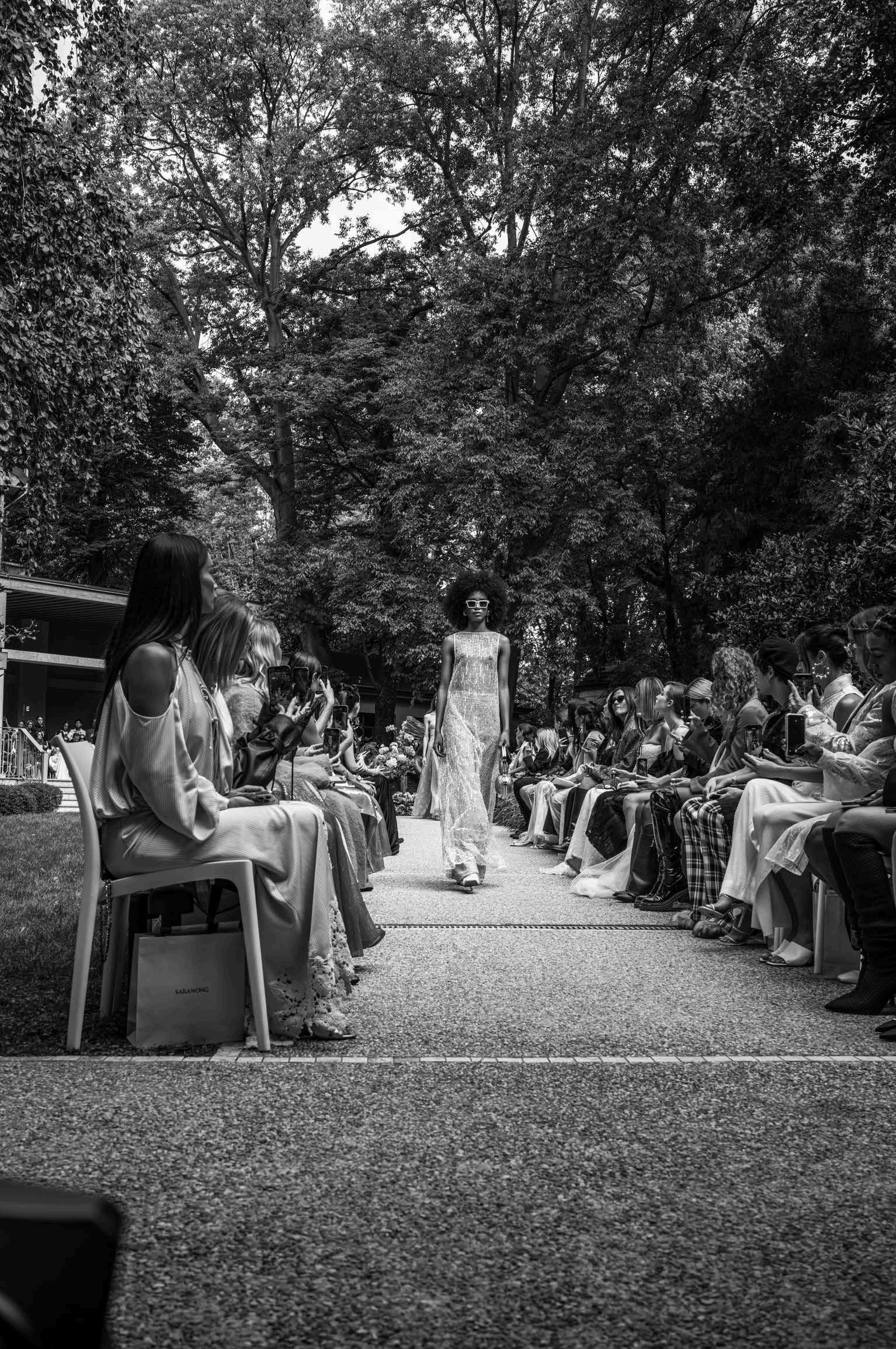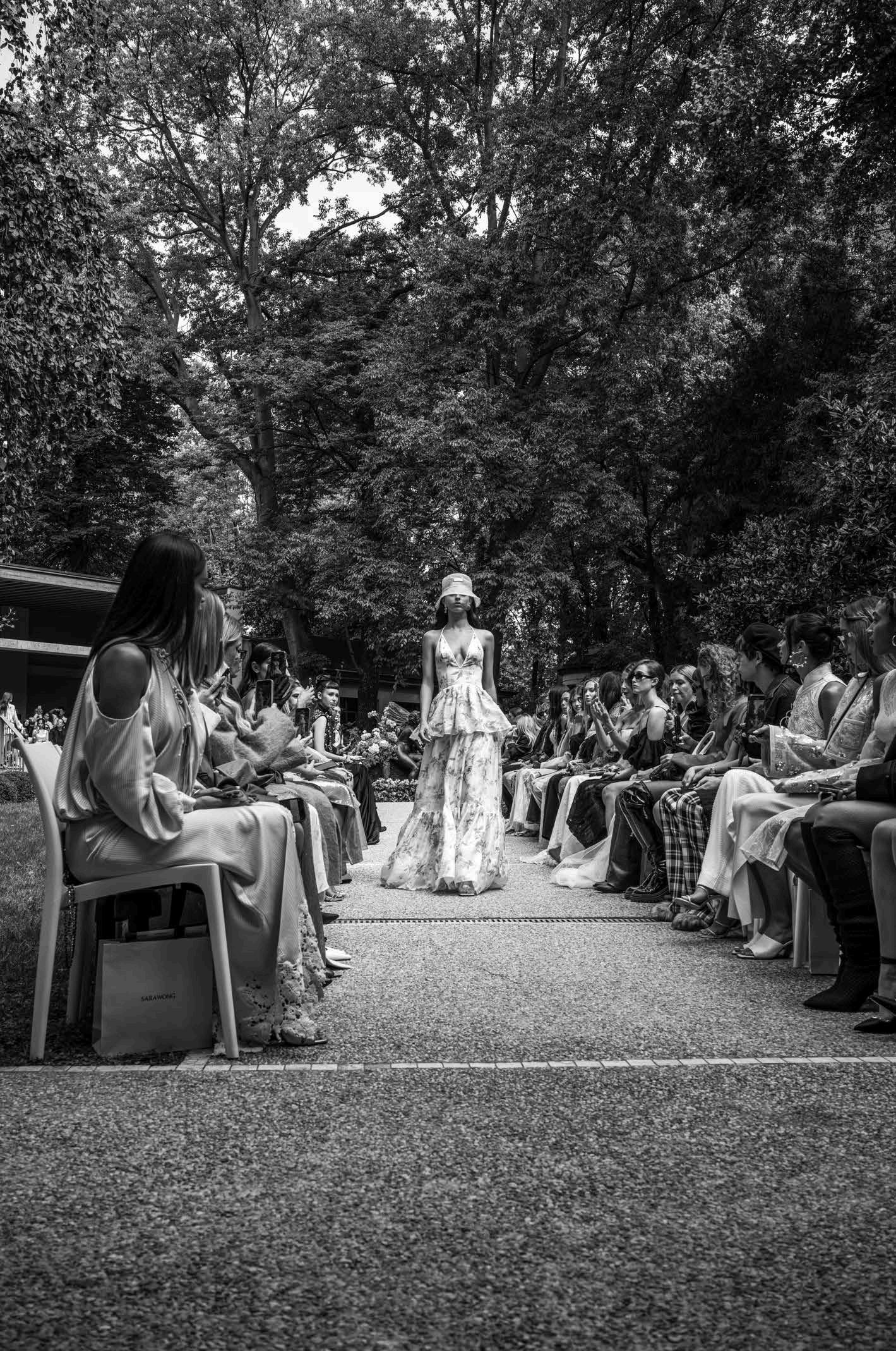 Set against the picturesque backdrop of a stunning Milanese courtyard, Sara Wong’s runway show felt like an intimate garden party where fashion and nature intertwined in perfect harmony. The collection lets us dream of sun-drenched afternoons by the beach, where style flows easily from day to night. A breezy, long silk dress danced beautifully under the golden rays of the sun but, when paired with dazzling accessories, transformed into an ethereal evening ensemble. The same philosophy extends to structured corsets and cropped jackets—pieces designed to complement various occasions with an effortless allure.