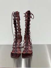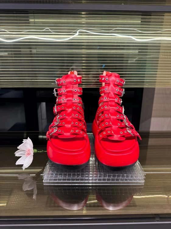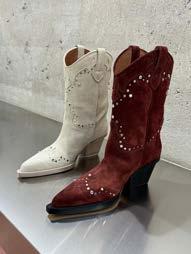 Also memorable were the intricate yet edgy Ella lace-up sandals, standing tall in a sultry rouge noir, and the studded Lavinia cowboy boots in a unique milk white leather.