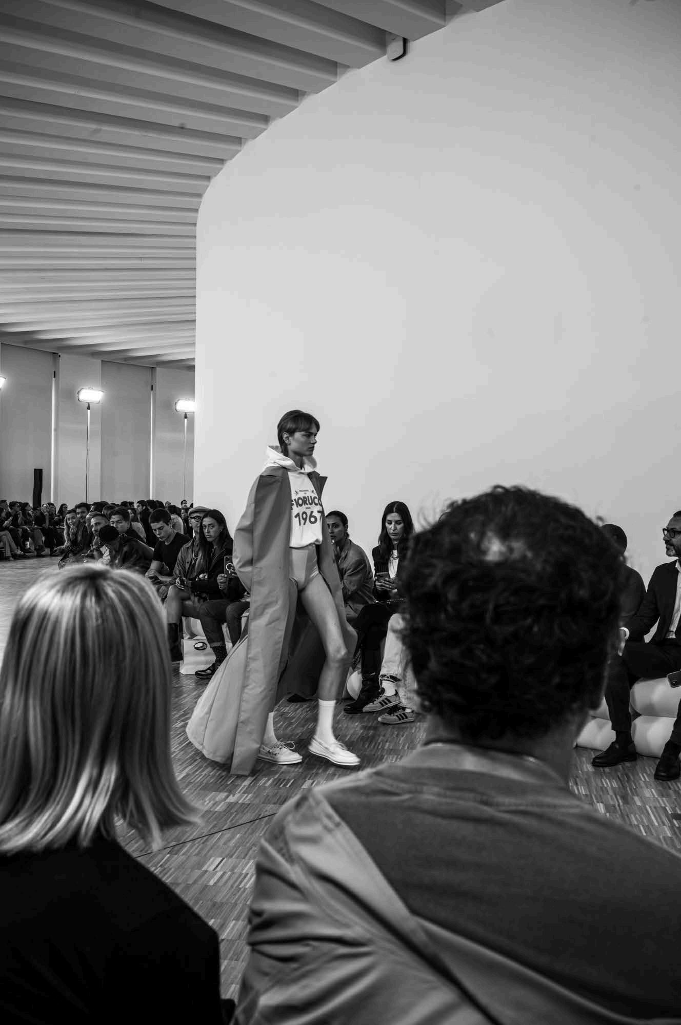 The collection, with designs for both men and women, opened with a series of sleek white looks. Initially appearing minimalist due to their monochrome nature, they in fact were a study in subtle and discerning details. A white men’s button-down, paired with baggy pants, featured a pleated flap emblazoned with the Fiorucci name extending from one shoulder as a faux crossbody.