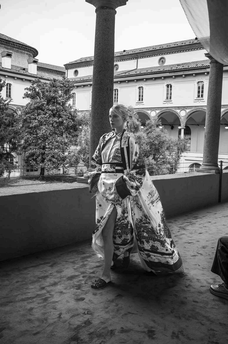 Iconic Milanese brand Curiel both reflected on its rich heritage and considered nature through a forward-thinking lens this season. The “Nature’s Tribute” Ready-to-Wear collection, which emphasized such romantic colours as cherry blossom pink, goose yellow, and aqua blue, used natural fabrics to re-connect wearers with their environments while promoting sustainable practices. Meanwhile, the Atelier collection proposed a series of stunning “aperitivo” dresses made from delicate silk chiffon, silk velvet, and organza. Timeless and minimalist in form, yet dramatic in effect (partially due to the way their materials refract the soft sunset light) they are a romantic tribute to the golden days of summer.