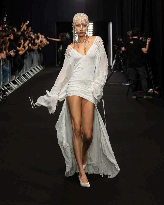 Ruffles, sequins, corsets, and asymmetrical silhouettes created an intriguing interplay of textures and movement, further emphasizing the brand’s dreamy and romantic essence. Pearls were intricately woven into the designs, appearing in bags and jewelry and enhancing the ethereal quality of the garments. Finally, crystals shimmered under the light, while sheer fabrics and feathered details added an airy, almost celestial dimension to the looks. The result is a wardrobe that feels effortlessly luxurious, perfectly suited for those who embrace elegance with a touch of playfulness.