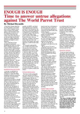 members, the RSPCA, and others. Such organisations are sometimes criticised for their bureaucracy, but they achieve a great deal, especially in the protection of the habitat they can afford to acquire. They don’t do as much as they might for the parrots, and that is where WPT can be seen to be active, very cost effectively, on behalf of our special interest. But I envy those vast incomes of the big guys, and would appreciate a crumb from their laden tables. So I can partly understand the envy of others in the parrot world who may have tried to achieve similar objectives to those of the World Parrot Trust, but have failed to make any impact. For several years we have been aware of one person in particular who has made untrue statements about the WPT. In our PsittaScene issue of February 1995 we published, with our latest accounts, an articles called ‘Putting the Record Straight’. We mentioned a ‘globe-trotting member’ who had been heard to tell a group of German aviculturists at a bird convention that the WPT ‘spent all its money on expensive lunches and dinners’. WITLESS PROPAGANDA This kind of witless propaganda may seem ridiculous, but when it continues over the years, it is bound to be damaging to the trust, its reputation, and its ability to achieve its aims. We have decided that we have no choice but to advise WPT members once again about an individual currently making libellous statements about the trust. Unfortunately, for legal reasons we cannot name him. He has, however, made the mistake of putting some defamatory remarks in writing, and has confirmed having done so. He sent a fax to Rosemary Low in which he said: ‘By the way, I have decided to resign from WPT since I can no longer justify supporting it. The last straw was the manifesto, which I find sickeningly hypocritical knowing MR’s views on private aviculture. I also believe WPT is more and more blatantly used to promote private interests. I understand some $850,000 has been