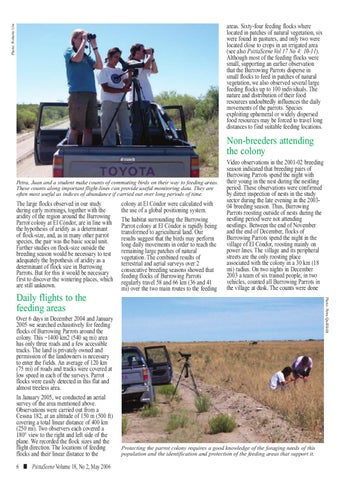 Over 6 days in December 2004 and January 2005 we searched exhaustively for feeding flocks of Burrowing Parrots around the colony. This ~1400 km2 (540 sq mi) area has only three roads and a few accessible tracks. The land is privately owned and permission of the landowners is necessary to enter the fields. An average of 120 km (75 mi) of roads and tracks were covered at low speed in each of the surveys. Parrot flocks were easily detected in this flat and almost treeless area. In January 2005, we conducted an aerial survey of the area mentioned above. Observations were carried out from a Cessna 182, at an altitude of 150 m (500 ft) covering a total linear distance of 400 km (250 mi). Two observers each covered a 180° view to the right and left side of the plane. We recorded the flock sizes and the flight direction. The locations of feeding flocks and their linear distance to the 6 ■ PsittaScene Volume 18, No 2, May 2006