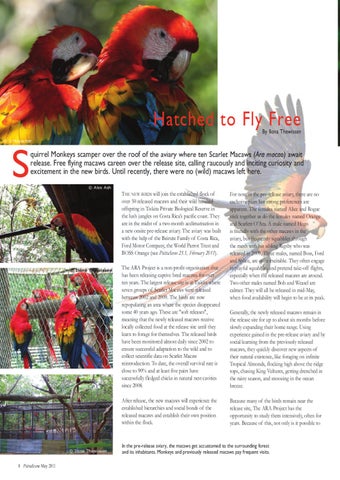 THE NEW BIRDS will join the established flock of over 50 released macaws and their wild hatched offspring in Tiskita Private Biological Reserve in the lush jungles on Costa Rica’s pacific coast. They are in the midst of a two-month acclimatisation in a new onsite pre-release aviary. The aviary was built with the help of the Beirute Family of Costa Rica, Ford Motor Company, the World Parrot Trust and BOSS Orange (see PsittaScene 23.1, February 2011). © Ilona Thewissen