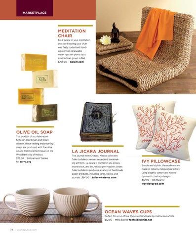 Olive oil soap The product of a collaboration between Palestinian and Israeli women, these healing and soothing soaps are produced with fine olive oil and traditional techniques in the West Bank city of Nablus. $25.00 | Sindyanna of Galilee for serrv.org