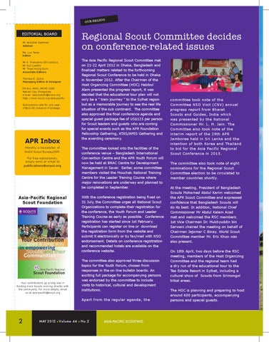 Mr S Prassanna Shrivastava Mr Syd Castillo Mr Thian Hiong Boon Associate Editors Theresa E. Quine Managing Editor & Designer PO Box 4050, MCPO 1280 Makati City, Philippines e-mail: asia-pacific@scout.org http://www.scout.org/asia-pacific Subscription rate for one year: US$12.00 inclusive of postage