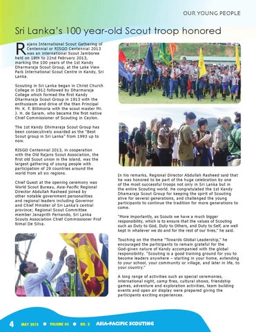ajans International Scout Gathering of Centennial or RISGO Centennial 2013 was an international Scout Jamboree held on 18th to 22nd February 2013, marking the 100 years of the 1st Kandy Dharmaraja Scout Group, at the Lake View Park International Scout Centre in Kandy, Sri Lanka. Scouting in Sri Lanka began in Christ Church College in 1912 followed by Dharmaraja College which formed the ļ¬rst Kandy Dharmaraja Scout Group in 1913 with the enthusiasm and drive of the then Principal Mr. K. F. Billimoria with the scout master Mr. J. H. de Saram, who became the ļ¬rst native Chief Commissioner of Scouting in Ceylon. The 1st Kandy Dhrmaraja Scout Group has been consecutively awarded as the āBest Scout group in Sri Lankaā from 1993 up to now. RISGO Centennial 2013, in cooperation with the Old Rajans Scout Association, the ļ¬rst old Scout union in the island, was the largest gathering of young people with participation of 29 countries around the world from all six regions. Chief Guest at the opening ceremony was World Scout Bureau, Asia-Paciļ¬c Regional Director Abdullah Rasheed joined by other notable government personalities and regional leaders including Governor and Chief Minister of Sri Lankaās central province; Regional Scout Committee member Janaprith Fernando, Sri Lanka Scouts Association Chief Commissioner Prof Nimal De Silva.