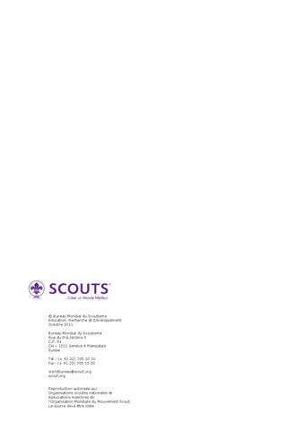 © Bureau Mondial du Scoutisme Education, Recherche et Développement Octobre 2011 Bureau Mondial du Scoutisme Rue du Pré-Jérôme 5 C.P. 91 CH – 1211 Genève 4 Plainpalais Suisse Tél.: (+ 41 22) 705 10 10 Fax: (+ 41 22) 705 10 20 worldbureau@scout.org scout.org Reproduction autorisée aux Organisations scoutes nationales et Associations membres de l’Organisation Mondiale du Mouvement Scout. La source deva être citée.