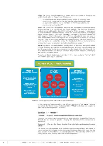Figure 1. The Scout Method in the Rover Scout Programme In the chapters of these guidelines the different elements of the “Why” (purpose and aims), the “How” (Scout Method) and the “What” (activities) are adapted to the Rover Scout Programme, as follows: