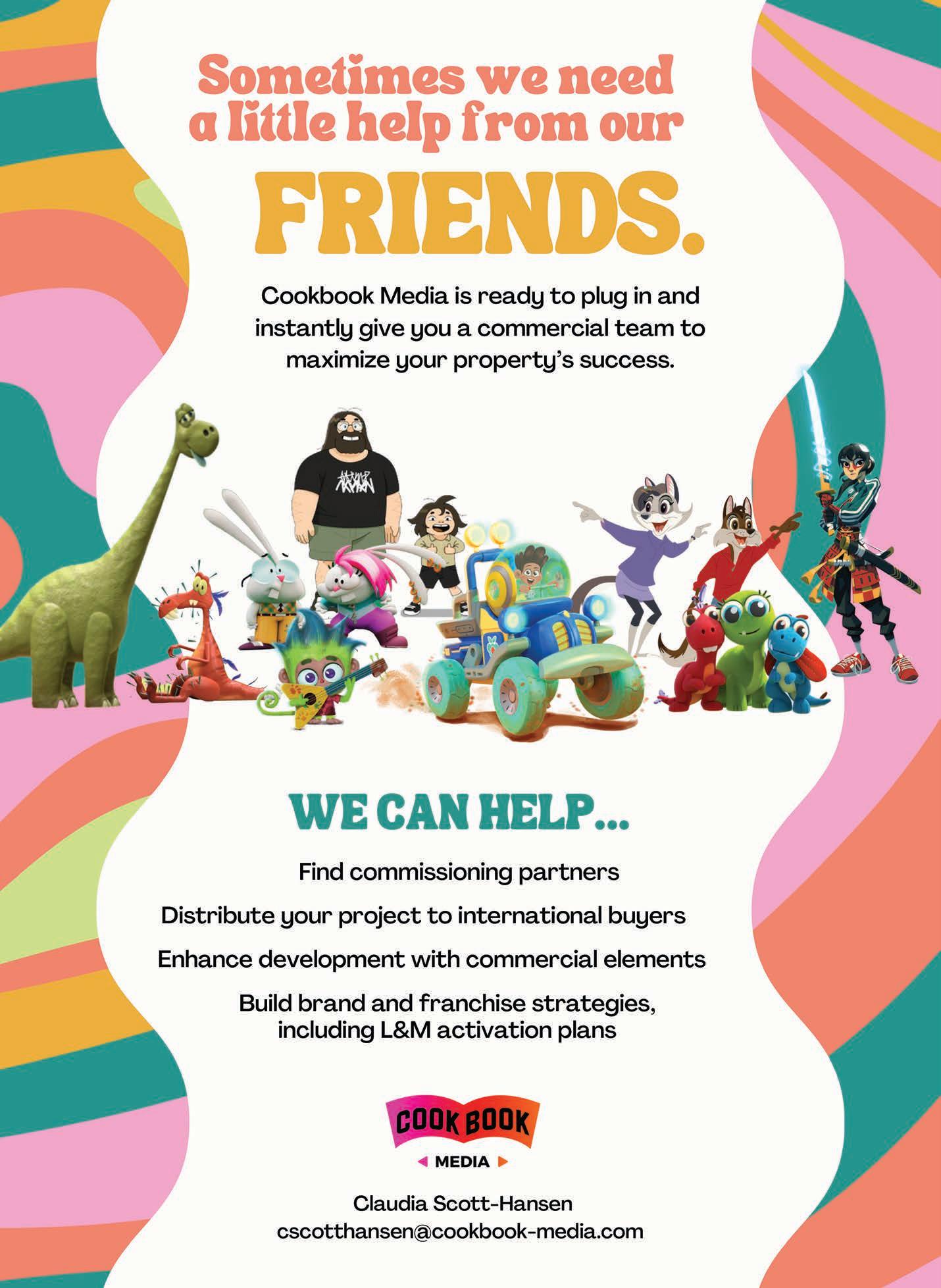 Cookbook Media has a busy June: it’s bringing new shows for commissioning and distribution to Annecy, embarking on projects with a few new partners and attending Licensing Expo to secure deals for properties it represents. “We have three exciting new projects across different age demos,” notes Claudia Scott-Hansen, partner. In the preschool space, there’s the dance- and musicdriven, social-emotional learning show Monkey Sing Monkey Do. For the bridge demo, there’s The Great Wolf Pack. For kids 6 to 11, there’s the slapstick comedy Snow Bunny Lodge Extreme.