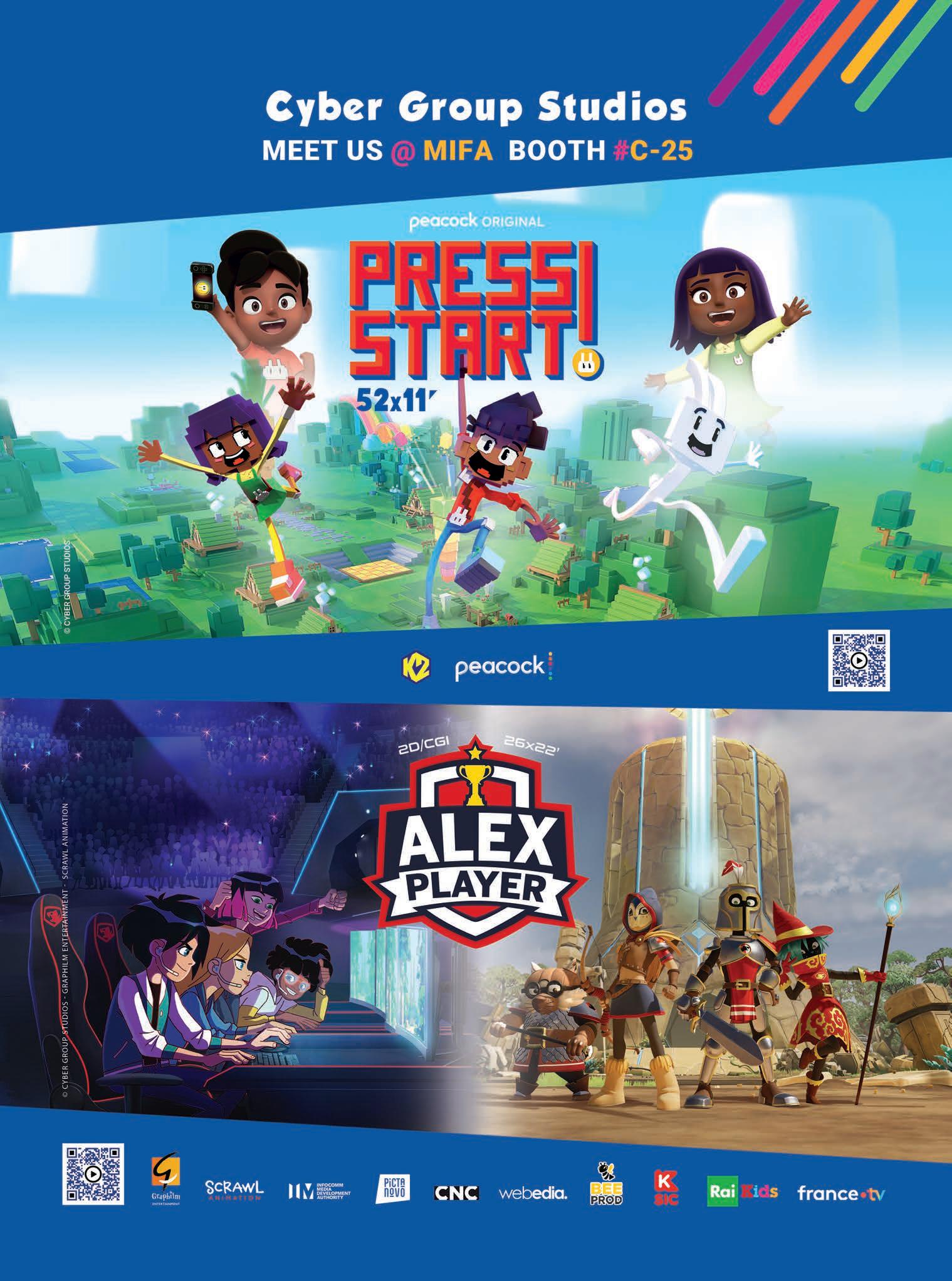 The CGI comedy-adventure Press Start!, part of the Cyber Group Studios slate, is based on a best-selling book series written and illustrated by Thomas Flintham that has sold more than 4 million copies worldwide. The show captures the wish-fulfillment of kids being able to have epic adventures inside a video game world alongside their best friend, who happens to be an iconic video game hero. Also video game related, Alex Player centers on an esports team that replaces its captain with a charismatic football player who emphasizes qualities of courage, perseverance and team spirit. The show is done in 2D and CGI and targets 6- to 10-year-olds. Cyber Group Studios also has a second season of Droners, featuring a high-tech adventure set in an eco-friendly world.