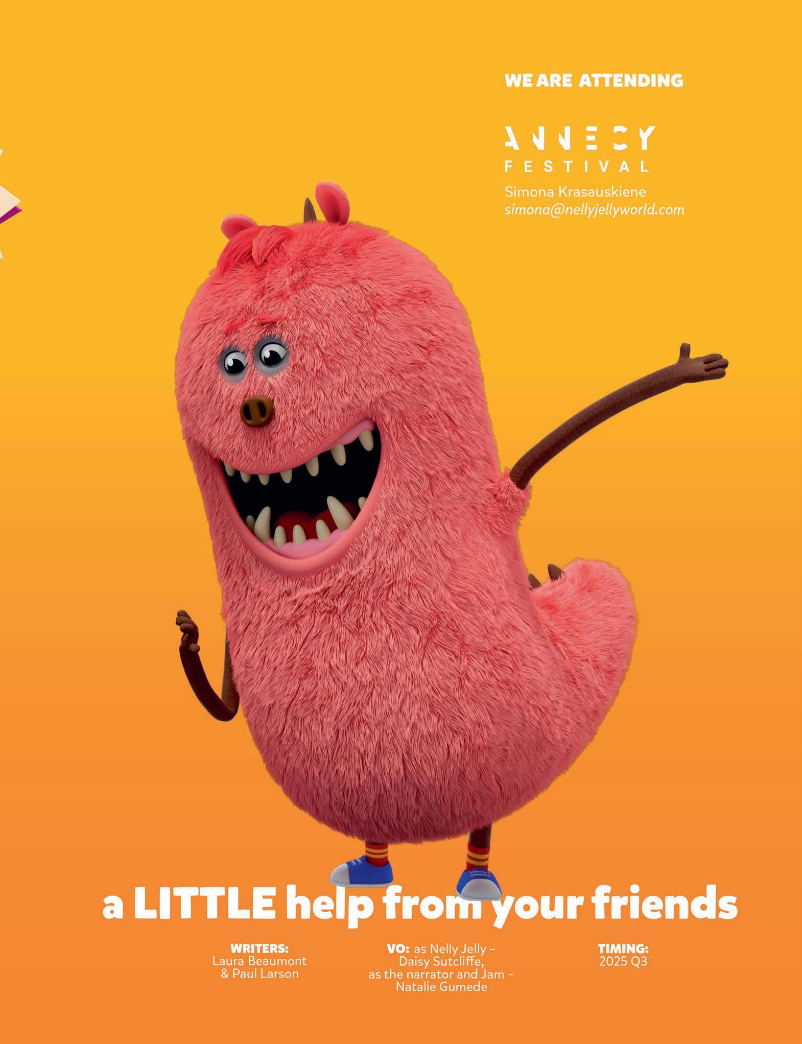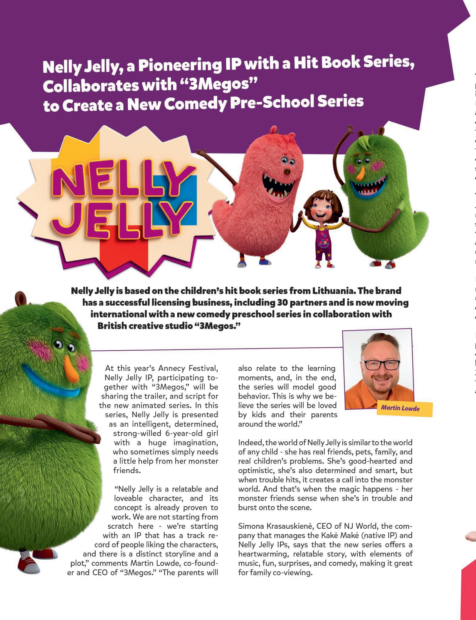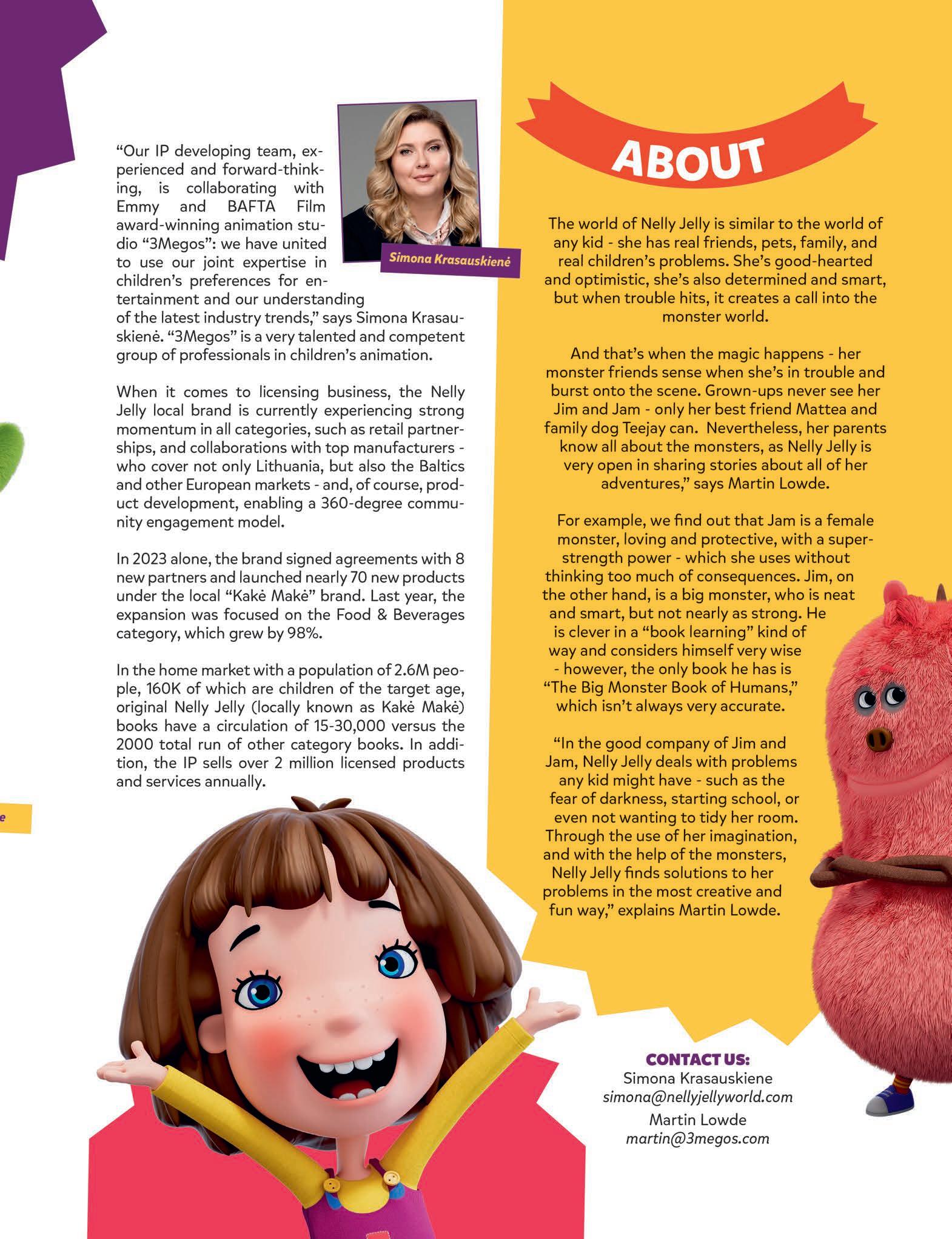 NJ World has teamed up with the British creative studio 3Megos for a new preschool comedy series based on the Nelly Jelly IP. The brand, building on the hit children’s book series from Lithuania, already has a successful licensing business, including 30 partners. A hit in Lithuania across publishing, live experiences and more, Nelly Jelly is now going global with a new preschool comedy series. The companies will be at Annecy sharing the trailer and script for the animated series, which centers on a strong-willed girl with a big imagination who sometimes simply needs a little help from her monster friends. “The new animation will work across different languages and cultures and extend engagement beyond the original Nelly Jelly books,” says Simona Krasauskienė, CEO of NJ World.