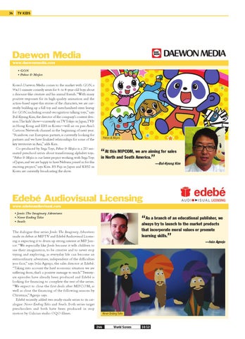 Korea’s Daewon Media comes to the market with GON, a 90x11-minute comedy series for 4- to 8-year-old boys about a dinosaur-like creature and his animal friends. “With many positive responses for its high-quality animation and the action-based super-fun stories of the characters, we are currently building up a full toy and merchandised-item lineup for GON, including sound-recognition talking toys,” says Bul-Kyung Kim, the director of the company’s content division.The kids’ show—currently on TV Tokyo in Japan,TVB in Hong Kong and EBS in Korea—will air on pan-Asia’s Cartoon Network channel in the beginning of next year. “Rainbow, our European partner, is currently looking for partners and we have finalized relationships for some of the key territories in Asia,” adds Kim. Co-produced by Sega Toys, Paboo & Mojies is a 2D animated preschool series about transforming alphabet toys. “Paboo & Mojies is our latest project working with Sega Toys of Japan, and we are happy to have Nelvana joined in for this exciting project,” says Kim. BS Fuji in Japan and KBS2 in Korea are currently broadcasting the show.