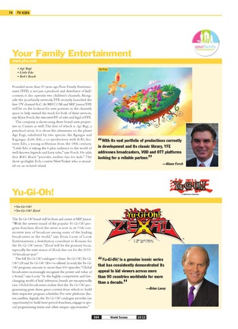 The Yu-Gi-Oh! brand will be front and center at MIP Junior. “With the newest strand of the popular Yi-Gi-Oh! program franchise, Zexal, the series is now in its 11th consecutive year of broadcast among some of the leading broadcasters in the world,” says Brian Lacey of Lacey Entertainment, a distribution consultant to Konami for the Yu-Gi-Oh! series. “Zexal will be the primary focus, especially the next season of Zexal, due out for the 201314 broadcast year.” The full Yu-Gi-Oh! catalogue—classic Yu-Gi-Oh!, Yu-GiOh! GX and Yu-Gi-Oh! 5Ds—is offered. In total, the Yu-GiOh! programs amount to more than 600 episodes. “Global broadcasters increasingly recognize the power and value of a brand,” says Lacey. “In the highly competitive and fastchanging world of kids’ television, brands are exceptionally rare. Global broadcasters realize that the Yu-Gi-Oh! programming gives them great content from which to build their respective program schedules. For new platforms (linear, satellite, digital), the Yu-Gi-Oh! catalogue provides [an opportunity] to build time-period franchises, engage in special programming stunts and other unique opportunities.”