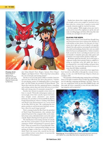utes Saban Brands’ Power Rangers Samurai, Power Rangers Megaforce and Digimon Fusion. “That’s what boys’ action allows for: a lot of role play and running around.” The key to success is the genre’s ability to translate characters and story lines effectively into those play patterns, “whether it’s role-playing, mastery of challenging tasks or action figure play,” says Elie Dekel, the president of Saban Brands. “The shows that work best also have aspirational heroes, compelling and exciting content, deep and varied off-screen access, relatability and a strong sense of community among fans.” Another key element in popular action series for boys is comedy. “Networks and program makers are increasingly aware that comedy repeats far better than straight action adventure,” says Sander Schwartz, the president of FremantleMedia Kids & Family Entertainment, which is working with Mattel and Nerd Corps Entertainment on a series based on the Max Steel toy line. “By combining the two genres, producers and broadcasters find they can sustain a show for much longer periods.” That’s a strategy backed by Ken Faier, the president of Nerd Corps Entertainment, who estimates that around 40 percent of his company’s titles can be classified as boys’ action, with hybrid shows such as the action comedy Slugterra showing how the genre has evolved. The introduction of increasing amounts of comedy into the boys’ action genre is in part driven by the expansion of kids’ entertainment in general, argues Faier. “There are around 24 to 25 specialist kids’ channels now, but their commissioning budgets are not getting any bigger, so they have to repeat things regularly. That’s one reason why comedy has become more evident in boys’ action shows—it increases the Powering up: FremantleMedia Kids & Family Entertainment partnered repeatability of the programs.” with Mattel for a new Max Steel series, inspired by the toy line. 354 World Screen 10/13
