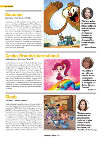 Gloob Time to Rock / Valentins / Brainiacs The first Brazilian channel for children, Globosat’s Gloob, is aimed at young viewers between the ages of 4 and 11 and is celebrating its fifth birthday this year. Among the network’s highlights are the new animated show Time to Rock and the live-action series Valentins and Brainiacs. “Time to Rock presents a unique rock band composed of four unpopular friends that travel through time and relive great moments of world history every time they play,” says Paula Taborda dos Guaranys, the head of content and programming at Gloob. “Valentins reinforces family values as four siblings unite to find their own courage and protect their parents from an ambitious villain. Brainiacs refers to a special school for gifted children where they discuss technology consciousness, social transformation and the role of innovative education.”