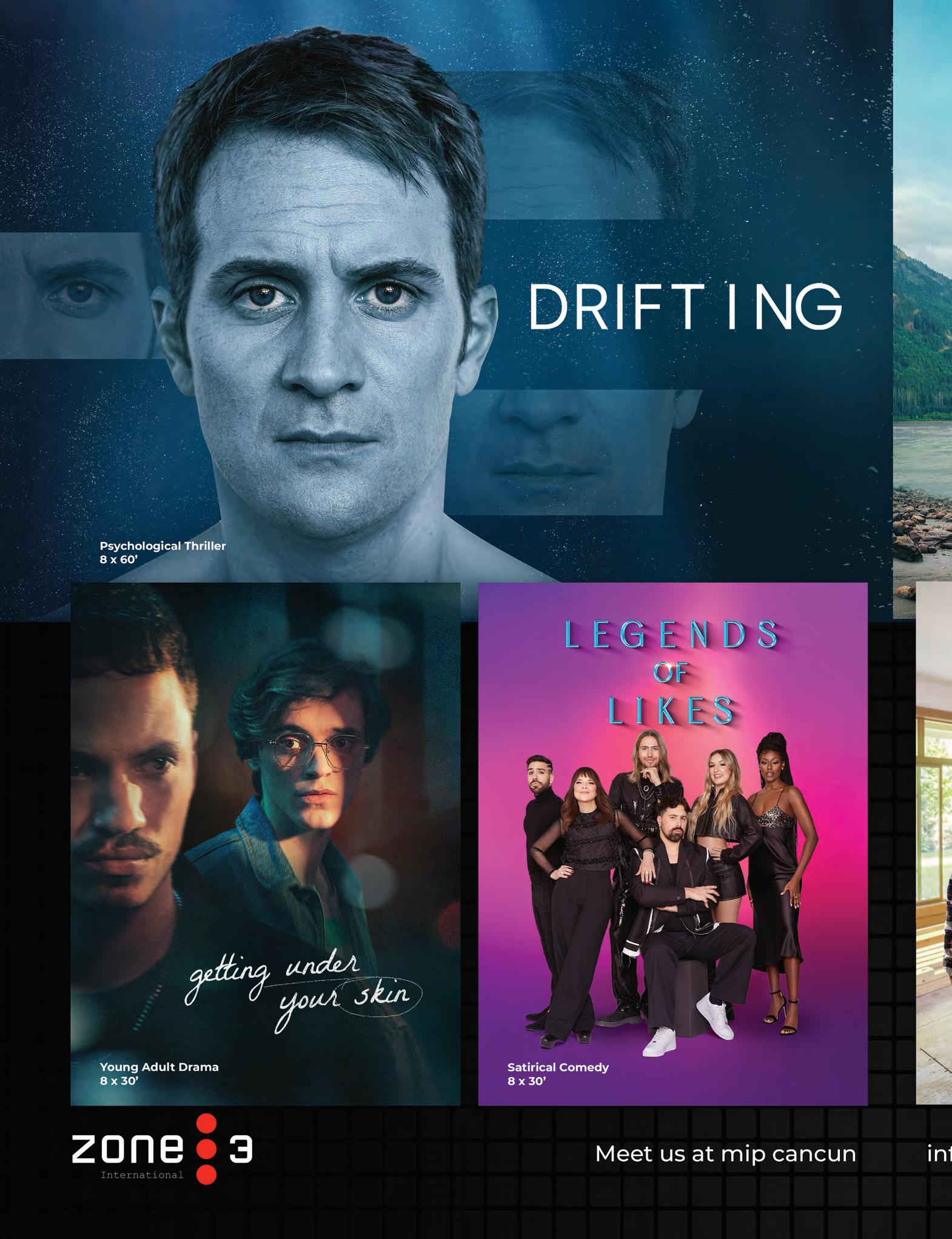 “Como una de las principales productoras independientes de Canadá, Zone3 crea, produce y distribuye IP originales de alta calidad y galardonadas en todos los géneros”, destaca Mélanie Ratté, VP, distribución internacional y desarrollo de negocios de Zone3 International. “En MIP CANCUN, presentamos una variada oferta de series de ficción, formatos de no ficción, series factuales y contenido infantil de acción en vivo”. Uno de los destacados de la compañía es Drifting, un thriller psicológico donde un pianista de renombre, atormentado por un trauma, emprende una peligrosa búsqueda de la verdad, descubriendo secretos familiares. Mientras, Getting Under Your Skin sigue los pasos de un adolescente queer que busca su emancipación y se ve involucrado en una operación encubierta. Zone3 International también presenta Legends of Likes