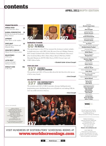 WORLD SCREEN is published seven times per year: January, April, May, June/July, October, November and December. Annual subscription price: Inside the U.S.: $70.00 Outside the U.S.: $120.00 Send checks, company information and address corrections to: WSN INC. 1123 Broadway, Suite 1207 New York, NY 10010, U.S.A. For a free subscription to our newsletters, please visit www.worldscreen.com.