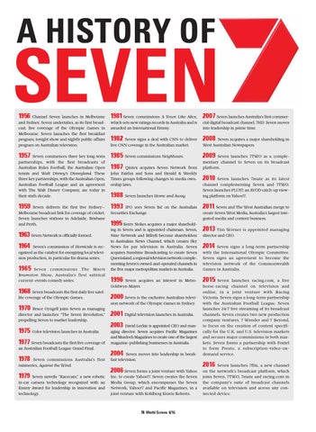 1956 Channel Seven launches in Melbourne 1981 Seven commissions A Town Like Alice, 2007 Seven launches Australia’s first commerand Sydney. Seven undertakes, as its first broadcast, live coverage of the Olympic Games in Melbourne. Seven launches the first breakfast program, tonight show and nightly public-affairs program on Australian television.
