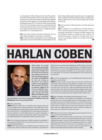 Manchester. [Co-stars] Amanda Abbington and Marc Warren are huge British stars. And then we have Audrey Fleurot, a wonderful, famous French actress. C8 is one of the [platforms] behind it. And our director for the first two episodes is Australian. So we are trying to represent the entire globe. It’s the time of international TV, why not put it all in one show? WS: As you’re devising ideas, are you thinking about what the ideal home for a show will be? COBEN: Not even a little. I do the idea, the story first, and then we worry about what network, what platform, is going to do it. I need to be binge-watched though. I want each episode to end, and then you want to go to the next one. Safe does that better than any other show I’ve done. And I always want that shocking ending. I know some of you think you’ve experienced that in trying to figure these things out, but you’re not going to guess the ending to Safe, I promise you! WS: Why is making a show binge-worthy important to you? COBEN: I’m a novelist, I write thrillers and suspense. If you take my book to bed at 10 o’clock at night and say, I’m just going to read for 15 minutes and the next thing you know it’s 4 o’clock in the morning and you’re cursing me out—I love that! I want you to not be able to put it down. I want to give you that same experience with a TV show. Safe is an eight-episode story, and so I want you to gulp it as much as you can, and savor it at the same time. WS: What have been some of the biggest lessons learned for you as you’ve done more television work? COBEN: As a novelist, you get a report card that says, “Does not play well with others.” And TV is all about playing with others. I love the collaboration aspect. I haven’t written any fewer novels. I’m able to still do the novels and I love that. I’m naturally an introvert—a socially adept introvert, but I am an introvert. I’m writing my 31st novel— that’s a lot of time alone in a room. So to get out and be able to collaborate with really talented people has been exciting.