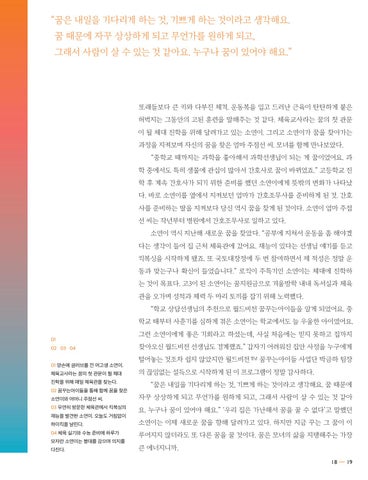 또래들보다 큰 키와 다부진 체격. 운동복을 입고 드러난 근육이 탄탄하게 붙은 허벅지는 그동안의 고된 훈련을 말해주는 것 같다. 체육교사라는 꿈의 첫 관문 이 될 체대 진학을 위해 달려가고 있는 소연이. 그리고 소연이가 꿈을 찾아가는 과정을 지켜보며 자신의 꿈을 찾은 엄마 주점선 씨. 모녀를 함께 만나보았다. “중학교 때까지는 과학을 좋아해서 과학선생님이 되는 게 꿈이었어요. 과 학 중에서도 특히 생물에 관심이 많아서 간호사로 꿈이 바뀌었죠.” 고등학교 진 학 후 계속 간호사가 되기 위한 준비를 했던 소연이에게 뜻밖의 변화가 나타났 다. 바로 소연이를 옆에서 지켜보던 엄마가 간호조무사를 준비하게 된 것. 간호 사를 준비하는 딸을 지켜보다 당신 역시 꿈을 찾게 된 것이다. 소연이 엄마 주점 선 씨는 작년부터 병원에서 간호조무사로 일하고 있다. 소연이 역시 지난해 새로운 꿈을 찾았다. “공부에 지쳐서 운동을 좀 해야겠 다는 생각이 들어 집 근처 체육관에 갔어요. 재능이 있다는 선생님 얘기를 듣고 킥복싱을 시작하게 됐죠. 또 국토대장정에 두 번 참여하면서 제 적성은 정말 운 동과 맞는구나 확신이 들었습니다.” 로킥이 주특기인 소연이는 체대에 진학하 는 것이 목표다. 고3이 된 소연이는 꿈지원금으로 겨울방학 내내 독서실과 체육 관을 오가며 성적과 체력 두 마리 토끼를 잡기 위해 노력했다. “학교 상담선생님의 추천으로 월드비전 꿈꾸는아이들을 알게 되었어요. 중 학교 때부터 사춘기를 심하게 겪은 소연이는 학교에서도 늘 우울한 아이였어요. 01 02 03 04 01 양손에 글러브를 낀 여고생 소연이. 체육교사라는 꿈의 첫 관문이 될 체대 진학을 위해 매일 체육관을 찾는다. 02 꿈꾸는아이들을 통해 함께 꿈을 찾은