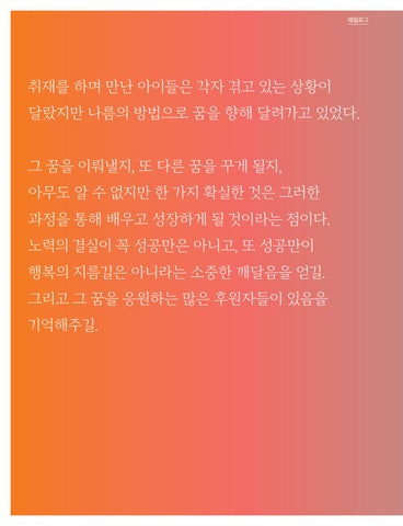 취재를 하며 만난 아이들은 각자 겪고 있는 상황이 달랐지만 나름의 방법으로 꿈을 향해 달려가고 있었다. 그 꿈을 이뤄낼지, 또 다른 꿈을 꾸게 될지, 아무도 알 수 없지만 한 가지 확실한 것은 그러한 과정을 통해 배우고 성장하게 될 것이라는 점이다. 노력의 결실이 꼭 성공만은 아니고, 또 성공만이 행복의 지름길은 아니라는 소중한 깨달음을 얻길. 그리고 그 꿈을 응원하는 많은 후원자들이 있음을 기억해주길.