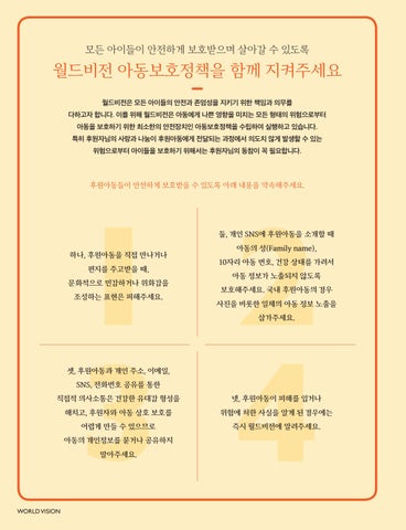월드비전 아동보호정책을 함께 지켜주세요 월드비전은 모든 아이들의 안전과 존엄성을 지키기 위한 책임과 의무를 다하고자 합니다. 이를 위해 월드비전은 아동에게 나쁜 영향을 미치는 모든 형태의 위험으로부터 아동을 보호하기 위한 최소한의 안전장치인 아동보호정책을 수립하여 실행하고 있습니다. 특히 후원자님의 사랑과 나눔이 후원아동에게 전달되는 과정에서 의도치 않게 발생할 수 있는 위험으로부터 아이들을 보호하기 위해서는 후원자님의 동참이 꼭 필요합니다.