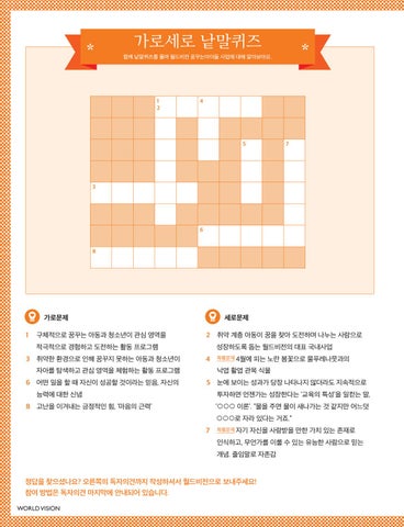 세로문제 2 취약 계층 아동이 꿈을 찾아 도전하며 나누는 사람으로 성장하도록 돕는 월드비전의 대표 국내사업 4 특별문제 4월에 피는 노란 봄꽃으로 물푸레나뭇과의 낙엽 활엽 관목 식물 5 눈에 보이는 성과가 당장 나타나지 않더라도 지속적으로 투자하면 언젠가는 성장한다는 ‘교육의 특성’을 일컫는 말, ‘○○○ 이론’. “물을 주면 물이 새나가는 것 같지만 어느덧 ○○○로 자라 있다는 거죠.” 7 특별문제 자기 자신을 사랑받을 만한 가치 있는 존재로 인식하고, 무언가를 이룰 수 있는 유능한 사람으로 믿는 개념. 줄임말로 자존감