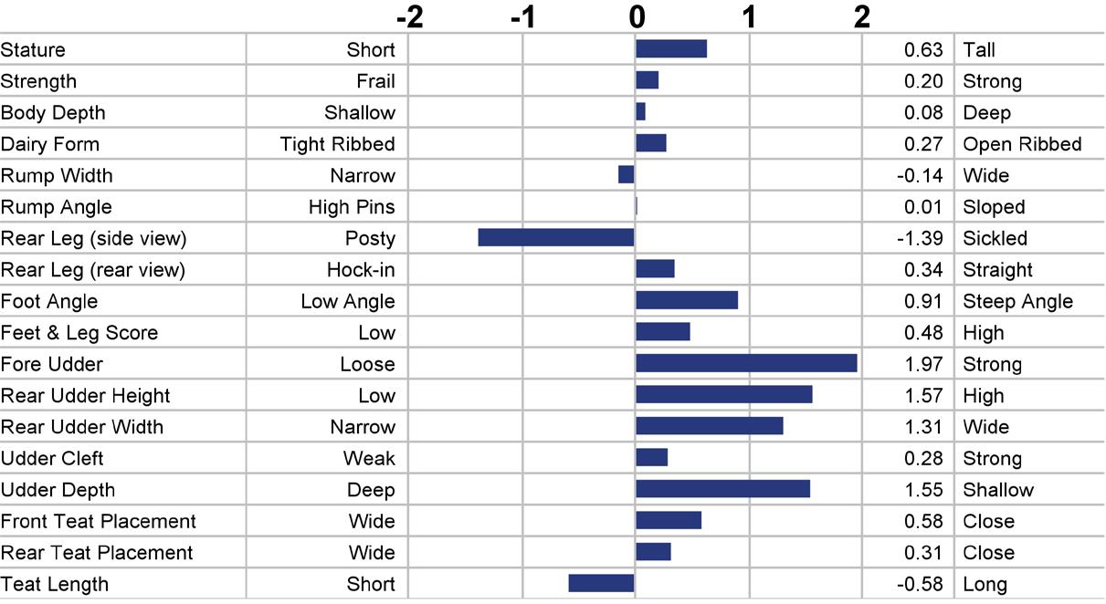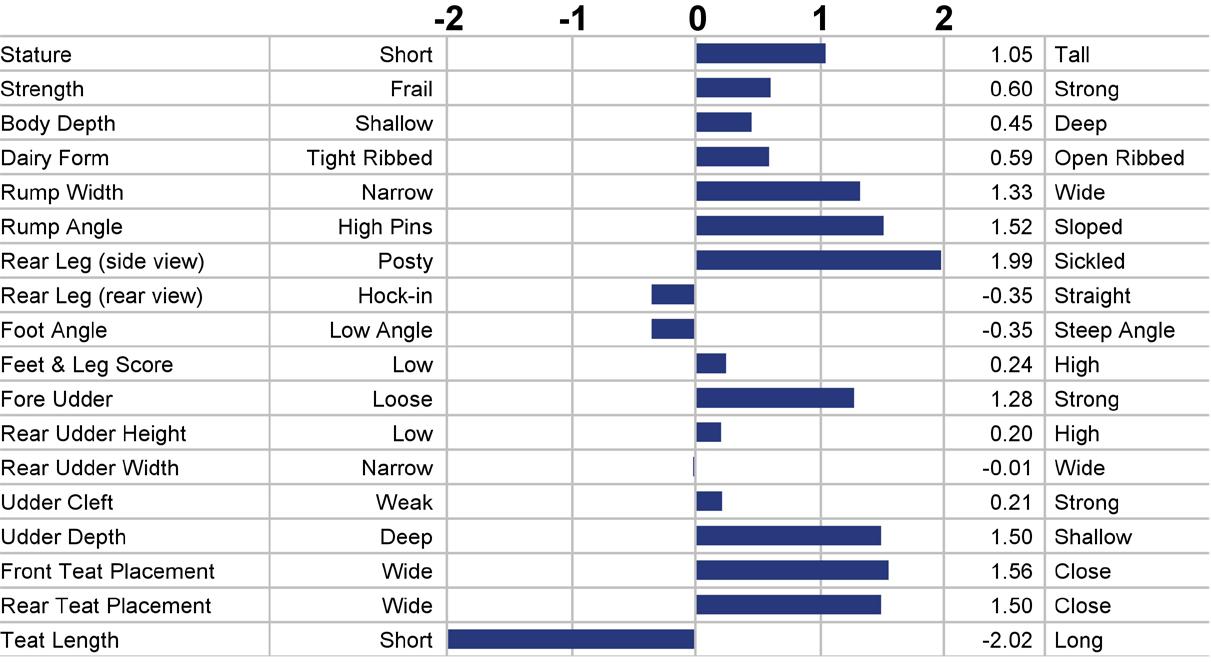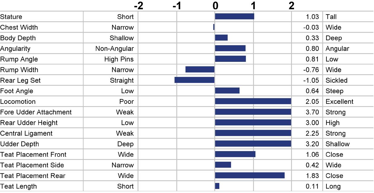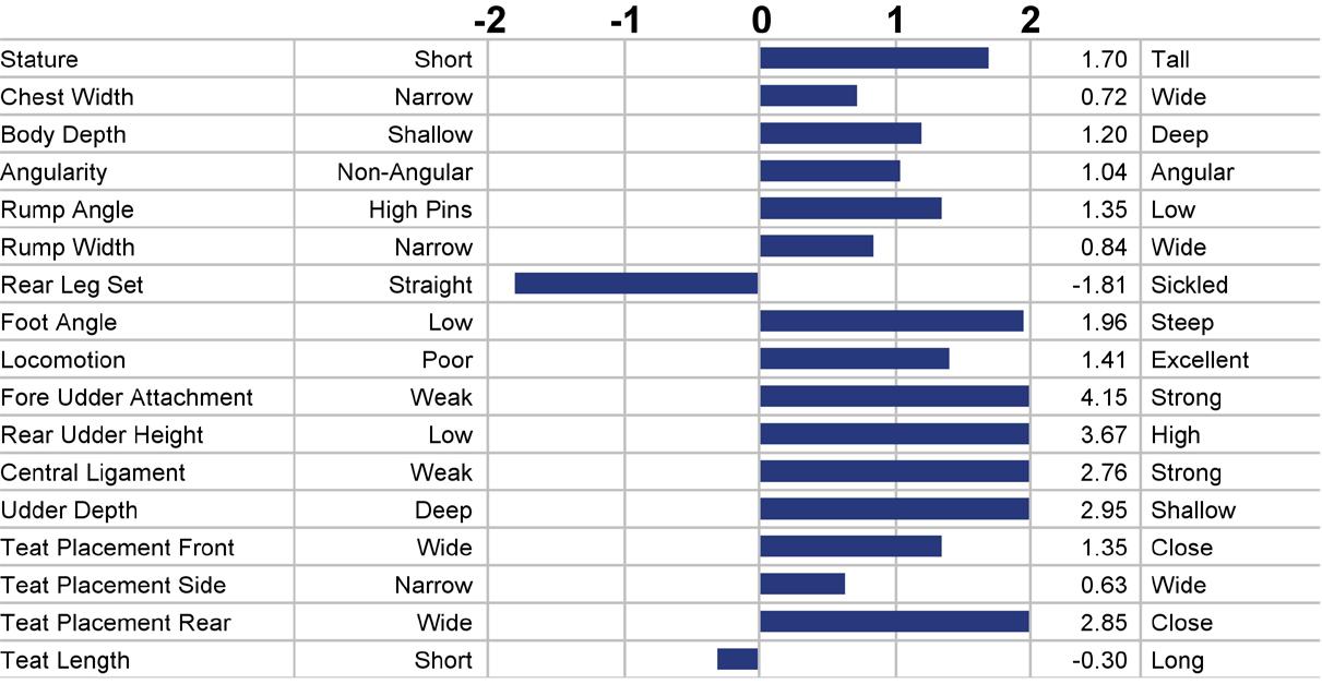 Type (PTAT) Udders (UDC) Feet & Legs (FLC) Body Weight Composite (BWC) The higher number is better for all traits.