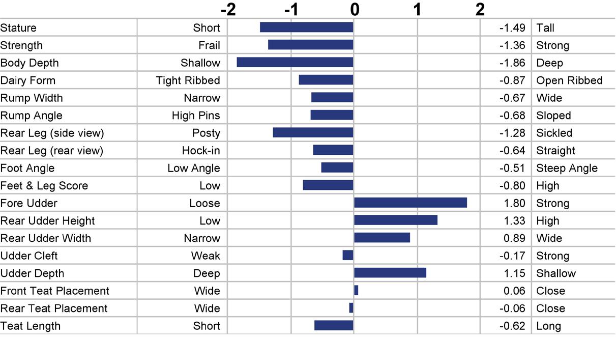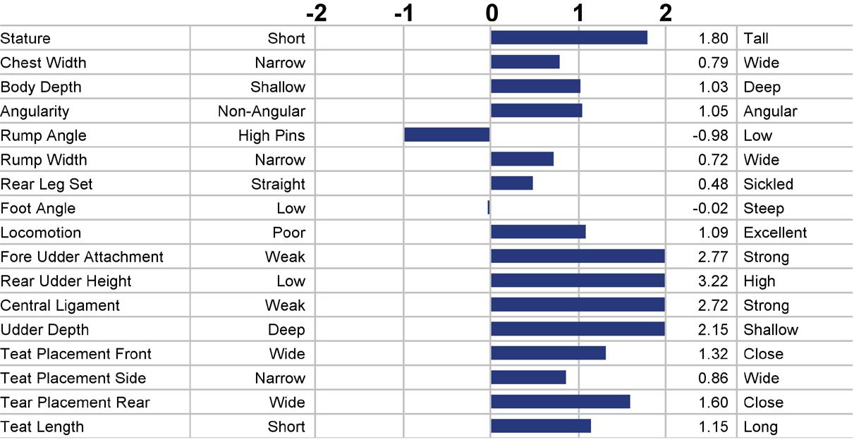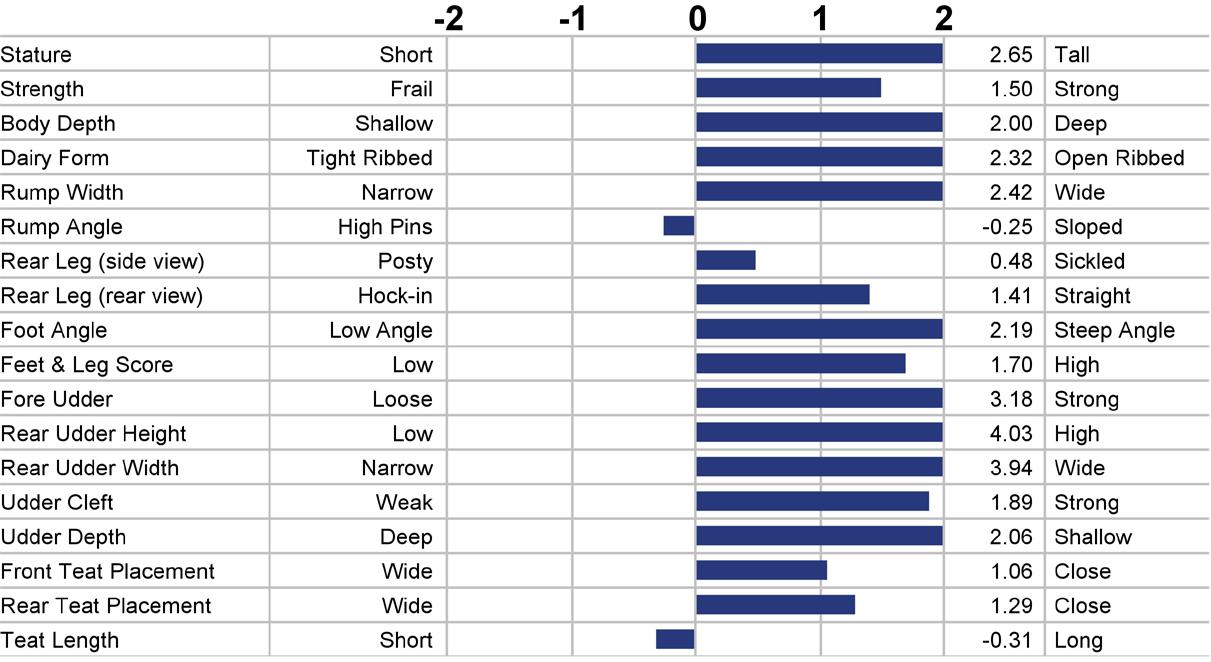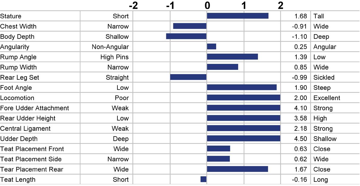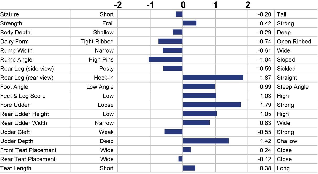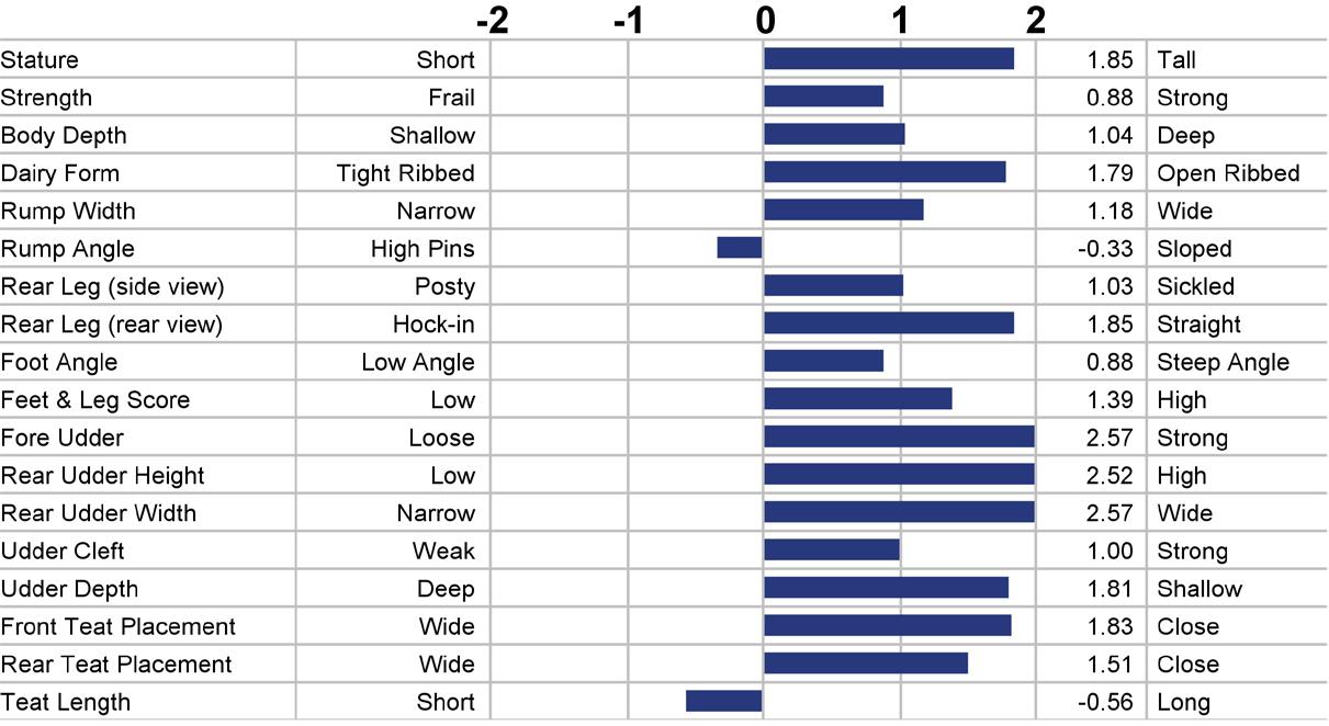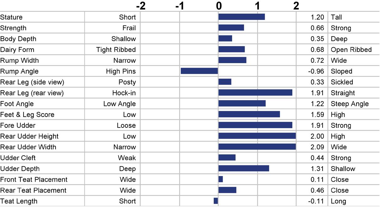 Type (PTAT) Udders (UDC) Feet & Legs (FLC) Body Weight Composite (BWC) The higher number is better for all traits.