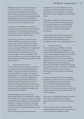 ARTWORK: Maddy Brown 15. BKSS being open for reduced hours (prior to COVID), and cuts to several ANUSA committees and projects. While ANUSA is almost certain to receive even less funding next year, ANUSA staff, including paid student representatives are currently required by ANUSA’s enterprise bargaining agreement to receive a 2% increase in pay each year. Figuring out how ANUSA can continue to provide the same level of services and support to students, or even expand its operations while salaries increase indefinitely, and overall funding decreases is a thorny puzzle. One solution may be to diversify revenue streams. PARSA, for example, has set up a bicycle shop in Kambri, and also has taken over the assets from the ANU Union when it wound up last year. Whether such an approach is viable for ANUSA remains to be seen. Unfortunately, while ‘diversifying revenue’ may be a tagline used by candidates in the upcoming election, students are unlikely to see any substantive business proposals before polls close in Week 5. 2. The Governance Review In 2018, ANUSA hired an external consultant to review the governance arrangements of ANUSA. This year the external consultants’ recommendations have been circulated to student reps, with a working group convened to discuss how to respond to suggestions. These include fundamentally restructuring ANUSA through changing the number of elected student representatives, changing up the roles of and duties of student reps as well as redesigning the relationship between the Clubs Council and ANUSA. Recommendations such as removing Department Officers (e.g. the Women’s Officer) from the SRC or halving the number of College representatives are unlikely to be implemented. However, a change more likely on the cards, could be the addition of a new Clubs Officer to the executive as a paid representative of the Association. Such a change would also fundamentally