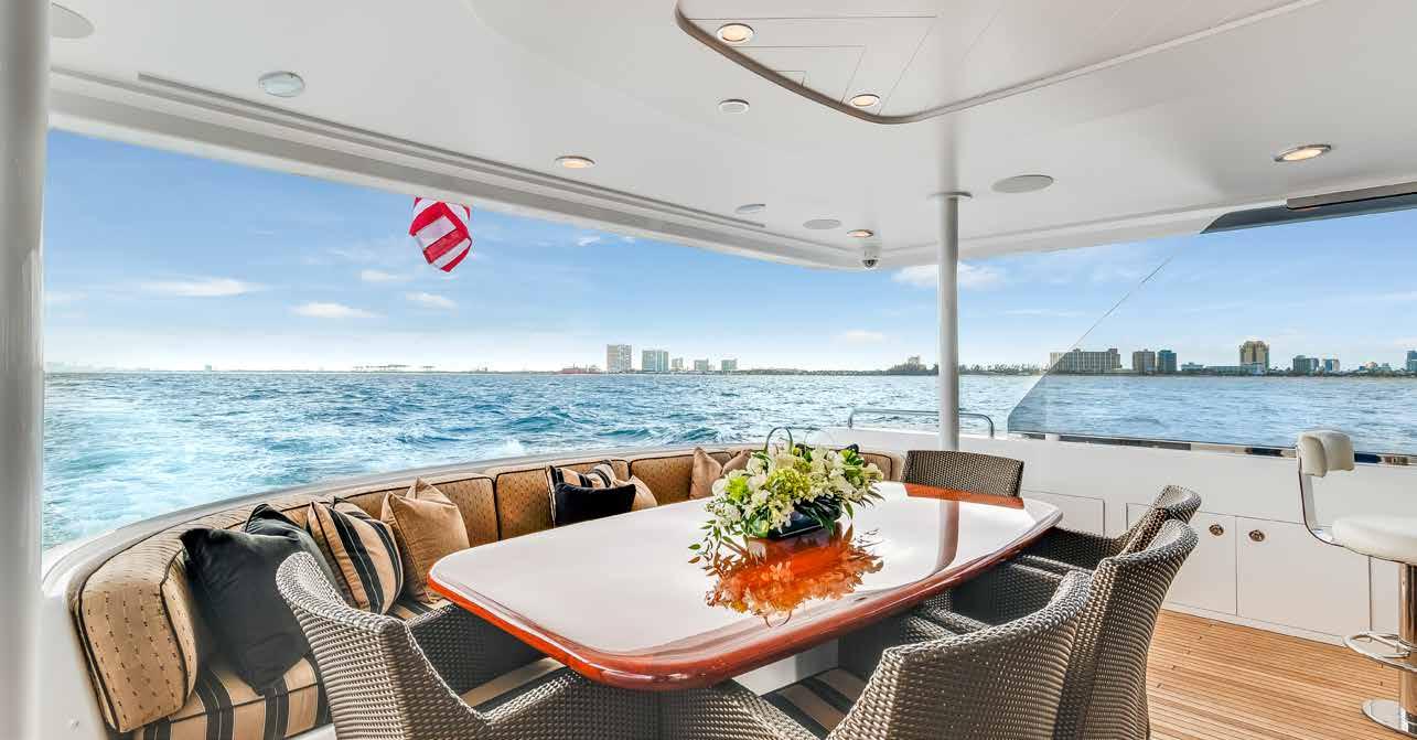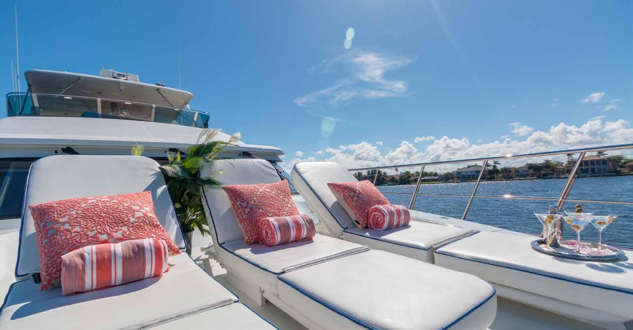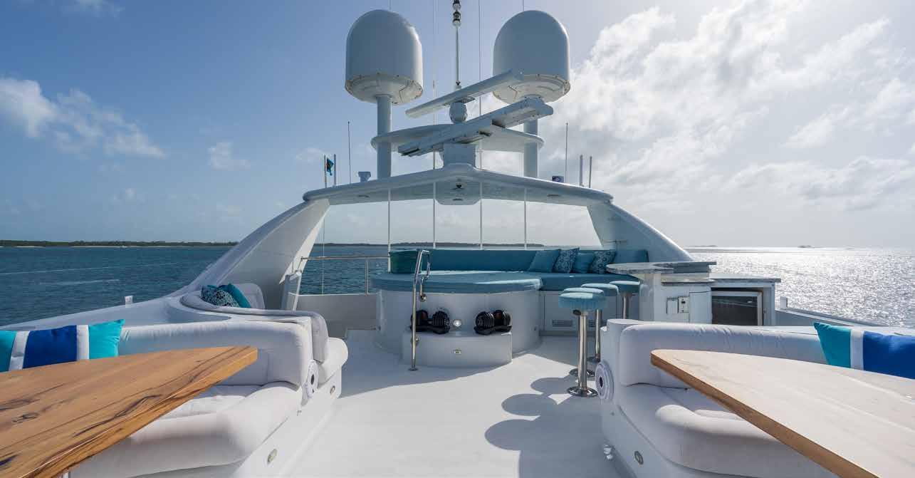 detail throughout your private yacht vacation. Relax and unwind on the aft deck seating area, soak up the sun on the sundeck's comfy lounger, or grab a refreshing cocktail at the bar. BELLA TU is the ideal vessel for exploring the crystal-clear waters of the Bahamas.
