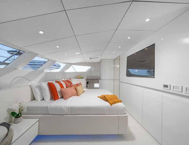 ocean view. SKYLARK's multi-hull design ensures maximum stability at anchor and underway, with low fuel consumption making her efficient yet powerful. Enjoy the Mediterranean sun on the spacious flybridge sunbed or indulge in the yacht's modern and organic atmosphere, providing a unique and tranquil oasis.