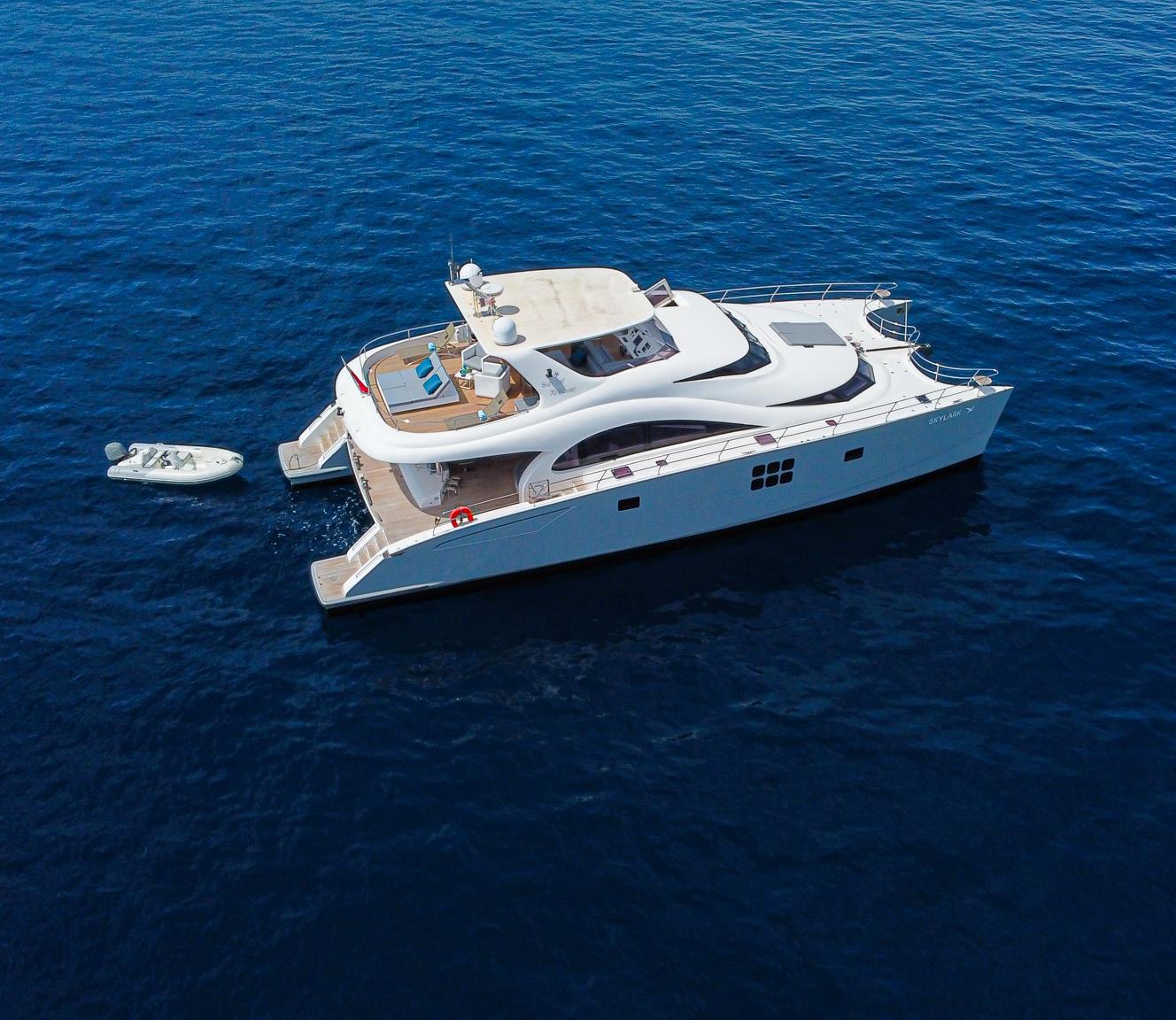 ocean view. SKYLARK's multi-hull design ensures maximum stability at anchor and underway, with low fuel consumption making her efficient yet powerful. Enjoy the Mediterranean sun on the spacious flybridge sunbed or indulge in the yacht's modern and organic atmosphere, providing a unique and tranquil oasis.