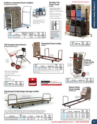 Stock Folding Chair Stack Chair Mfg. Our No. LxWxH Capacity Capacity Wt. List Price *89021 50¾” x 22” x 43¼” 24 2 Stacks 49 $213.00 $179.95 *89022 67” x 22” x 43¼” 32 3 Stacks 55 245.00 209.95