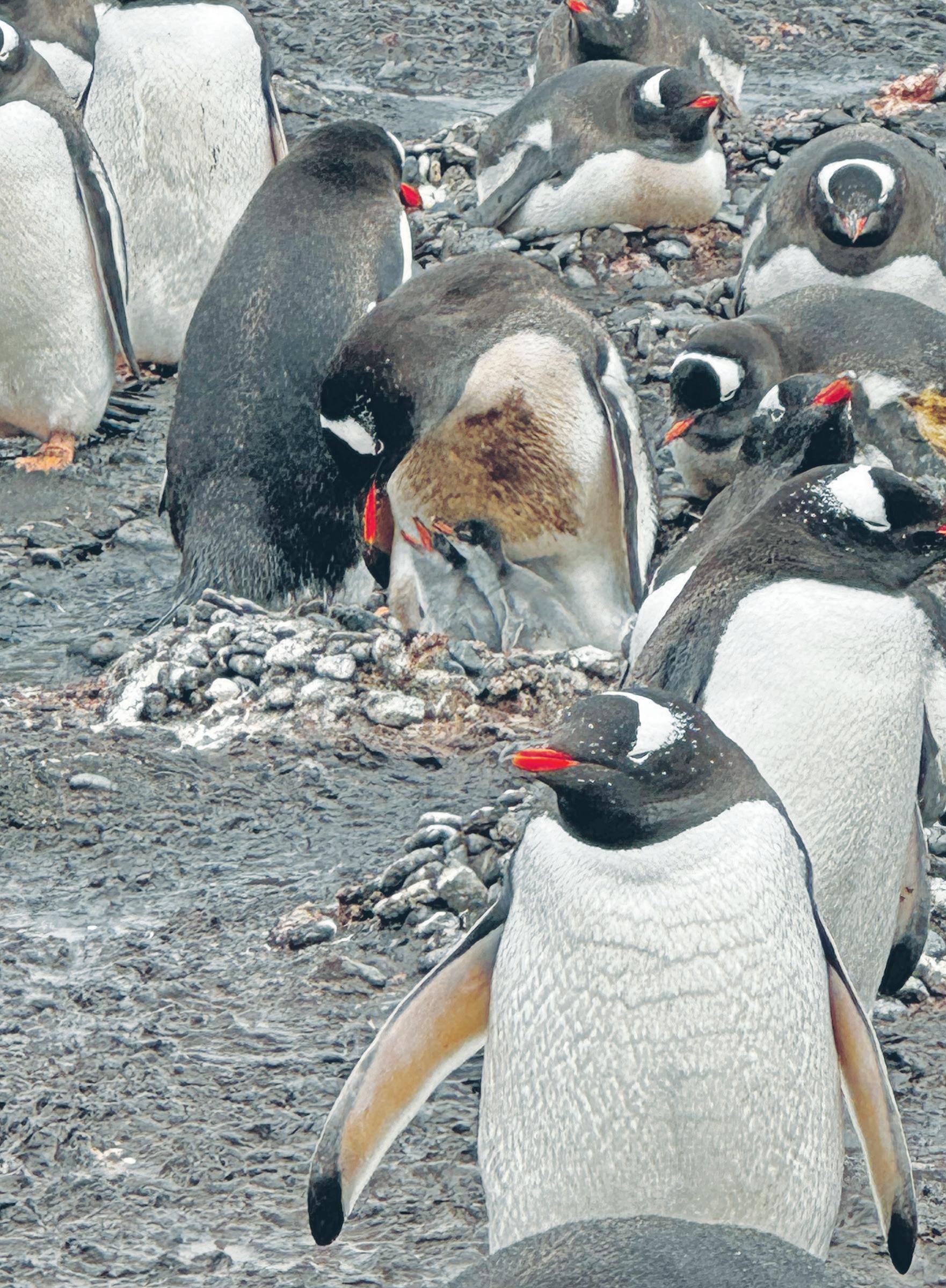 When an Adélie penguin decided to plant itself in front of the group’s path, everyone had to stop and wait until the penguin decided to move. Then, two other penguins decided to follow the group, waiting behind them wanting to be a part of the group.