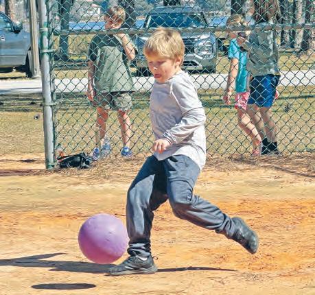 Left: First-grader Wyatt Johnson kicked the ball as hard as he could in the kickball game against parents.
