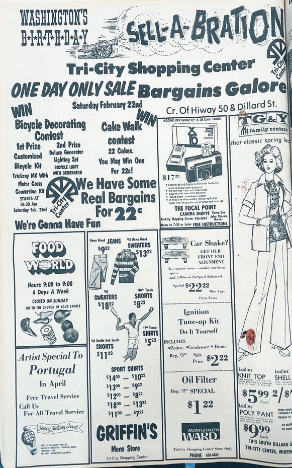 The Tri-City Shopping Center was holding a “sell-a-bration” in honor of Washington’s birthday Feb. 22, 1975. The businesses got together and took out an advertisement in The Winter Garden Times announcing all the great merchandise for sale. Happy Holiday Travel was offering a special trip to Portugal in April. At Montgomery Ward, car owners could get an oil filter for $1.22, an ignition tune-up kit for $2.22