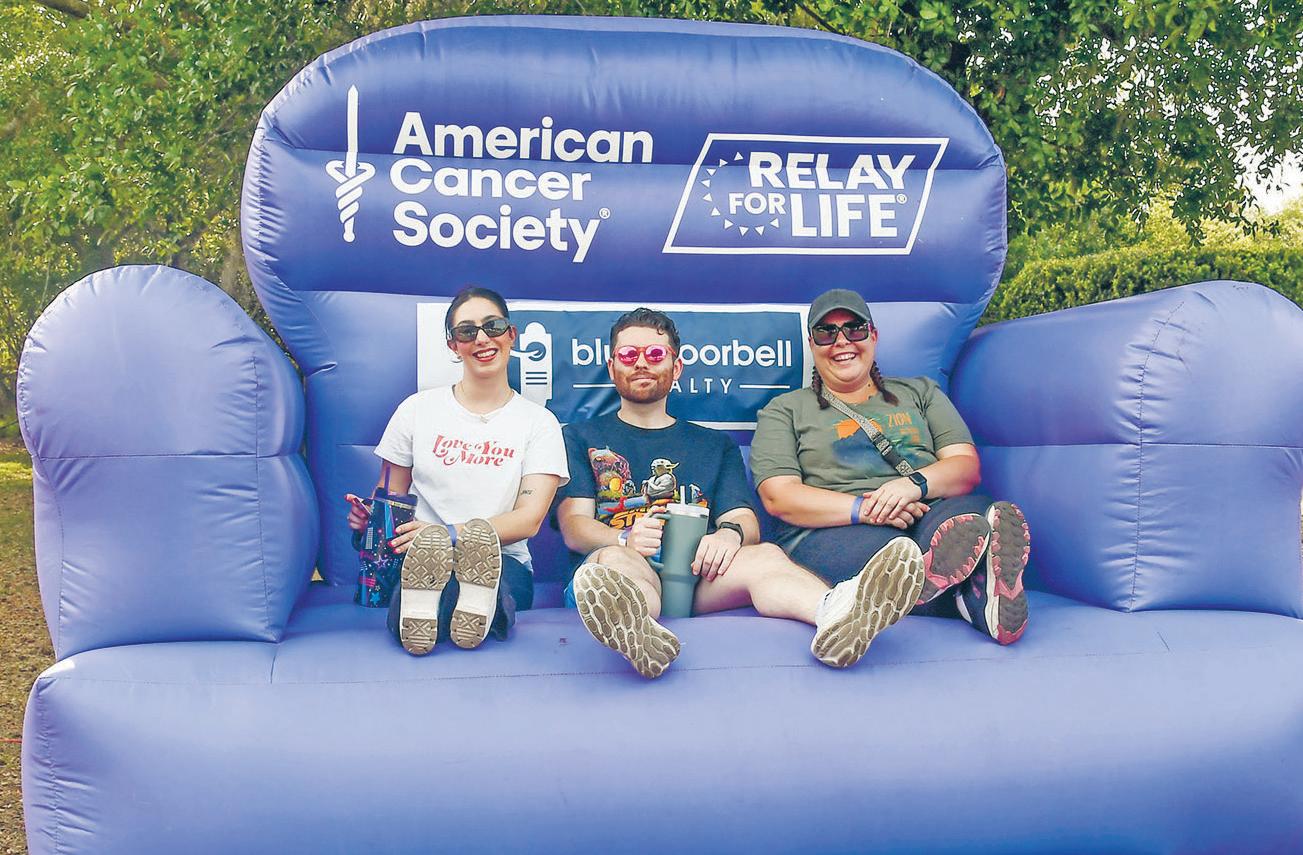 Cali Digiuseppe, left, Dalton Riggs and Aubri Johnson of the Pirates of the Cure-ibbean team took a break from walking laps to sit in the oversized inflatable chair.