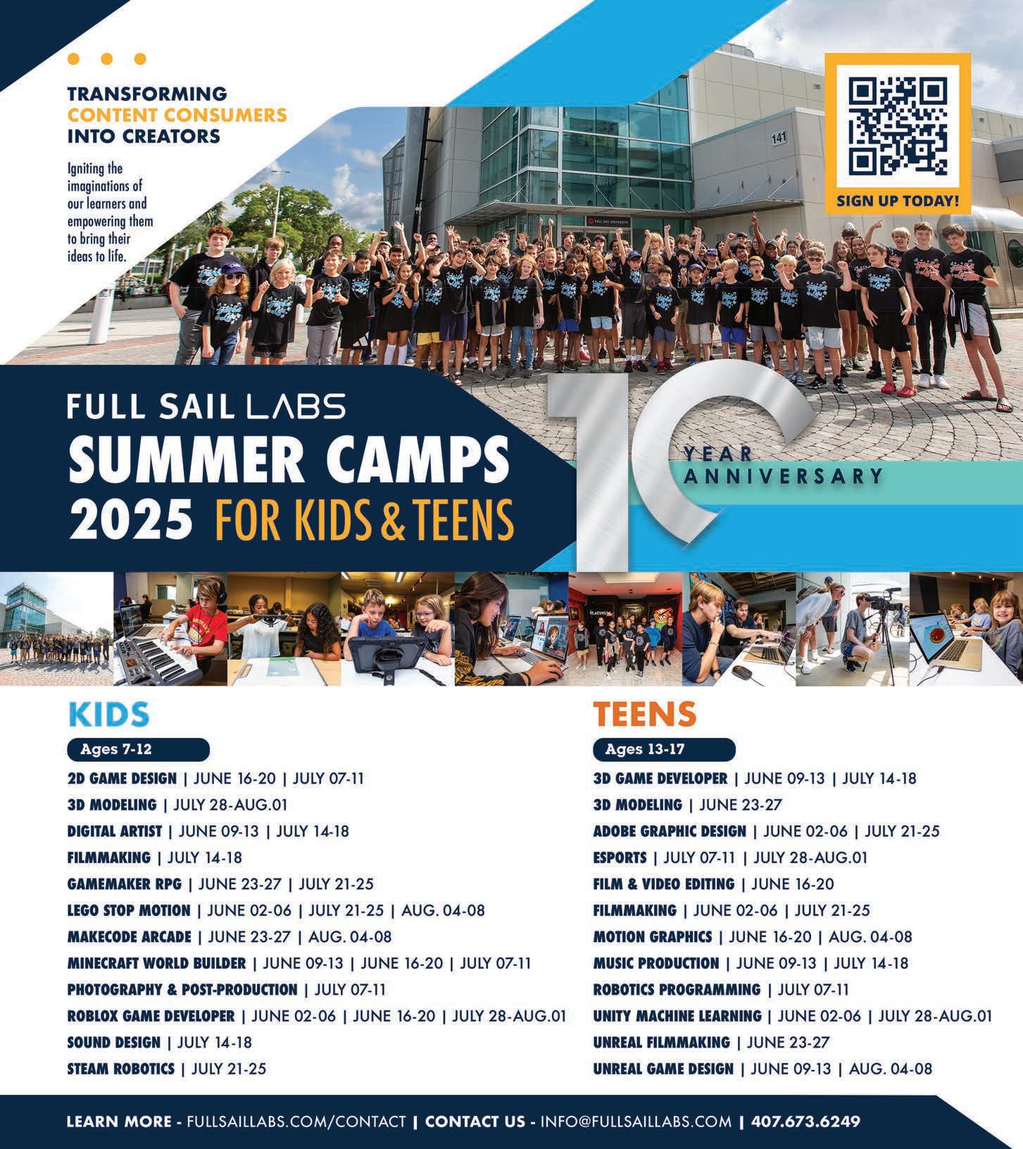 Details: Full Sail Labs o ers a full slate of summer camps designed to transform kids and teens from content consumers into content creators. Camps include topics such as Adobe Photoshop, game design, stop-motion animation, coding, Unity game development, music production, Minecraft, cinematography, lmmaking, STEAM sound design and 3D modeling.