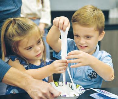 Ellie and Emmalynn Elliott worked together to make a bridge out of spaghetti noodles and marshmallows. Danica and Chase Hillner were amazed to see their slime come to life.