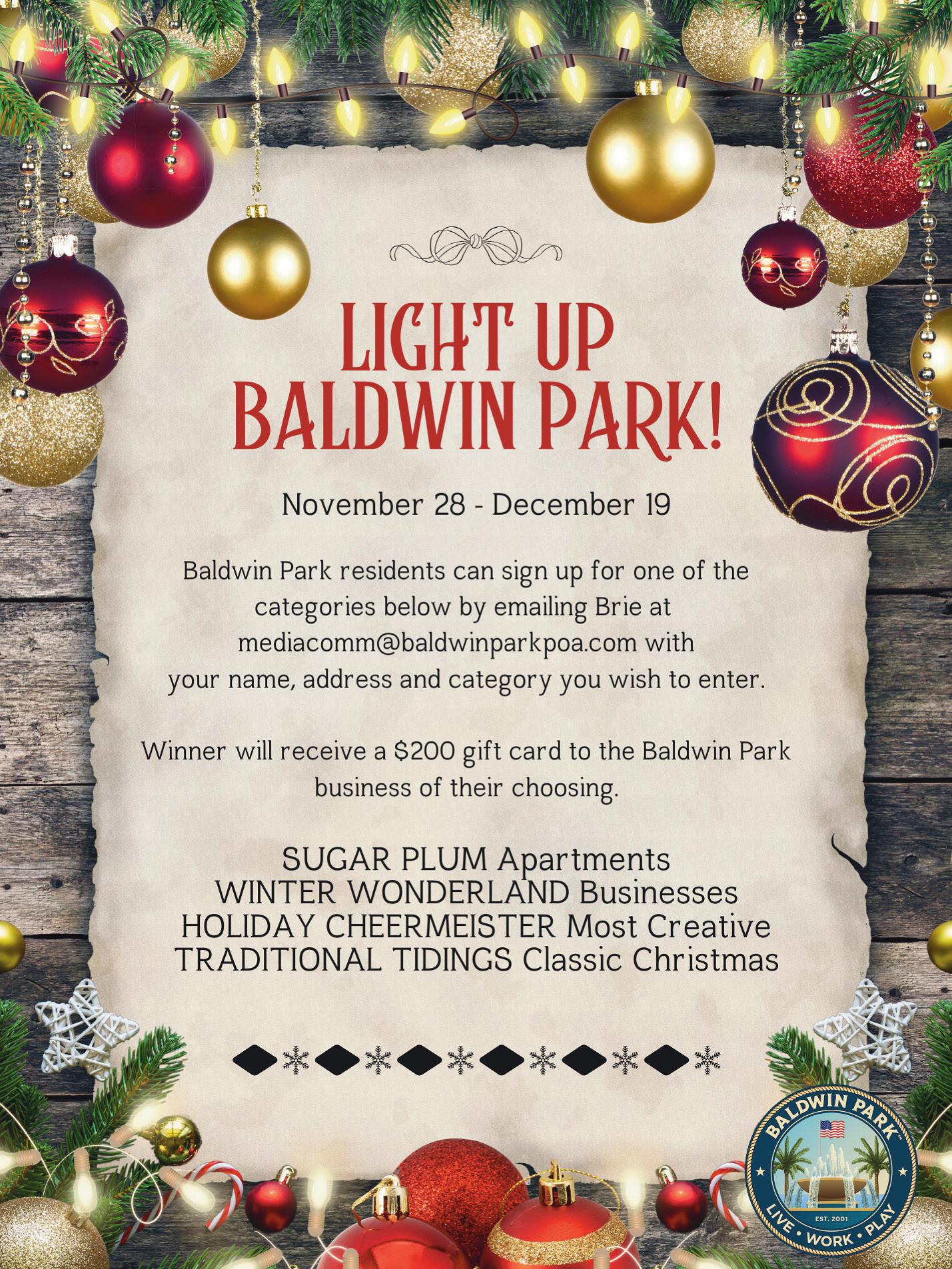 Before driving around to check out some holiday lights and see who you think should win this year’s Light Up Baldwin Park (check our social media bios for the map link), check out the December Food Trucks in the Park taking place Friday, Dec. 19, at Corrine Commons. The holiday addition of our monthly event will feature free-to-play HUGE inflatable games, a customizable ornament station, extra food trucks and holiday music filling the air. Enjoy the gorgeous weather while meeting new neighbors or having a chat with some friends. Take a blanket or chair, and we will see you there!