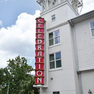 Celebration o ers visitors a glance of an early 20th-century architectural style with its picturesque buildings and unique infrastructure. Graphic designer Michael Beirut was hired by Disney to design street signs, retail signage, fountains, golf course graphics, park trail markers and more.