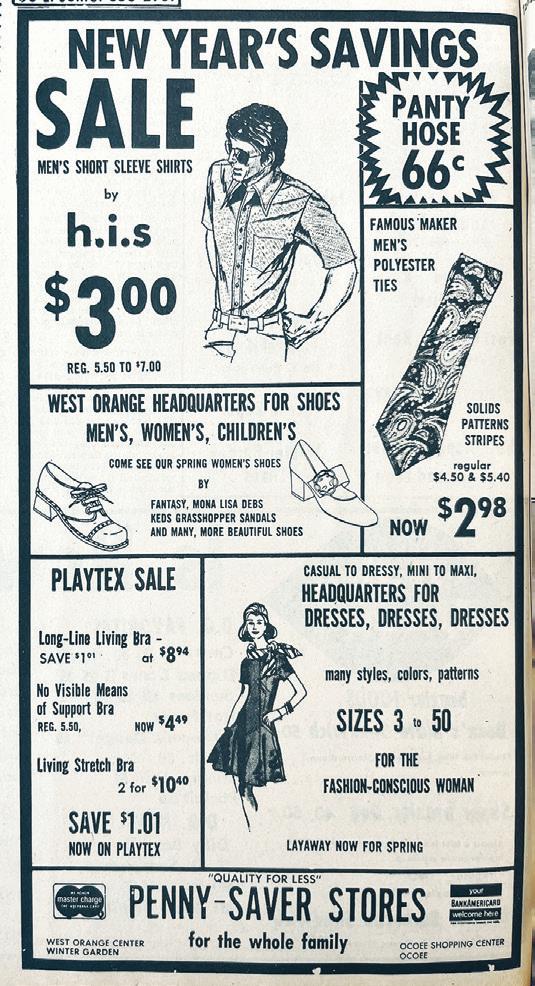 Tons of bargains could be found at Penny-Saver stores in the West Orange Center in Winter Garden and the Ocoee Shopping Center in Ocoee, which advertised in The Winter Garden Times. Both Master Charge and BankAmeriCard were accepted at the clothing shops.
