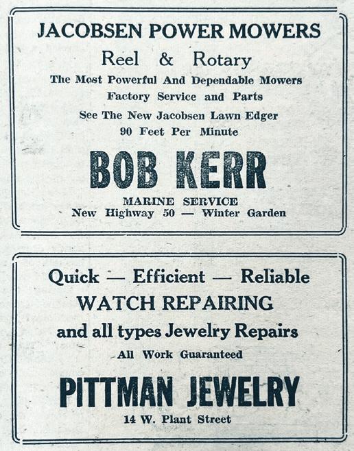 The Winter Garden Times ran an advertising page in 1954 for business owners who wanted to remind residents of their services on a weekly basis. Citizens could call 363 Blue to request a 24-hour wrecker service through Traywick’s Garage; get watches and other jewelry repaired at downtown’s Pittman Jewelry; phone 307 to inquire about Highfill Dry Cleaners; get a free demonstration of the sensational new Philco TV (with no obligation) at Bradford Furniture Co.; and see the new Jacobsen lawn edger at Bob Kerr Marine Service on the new Highway 50.