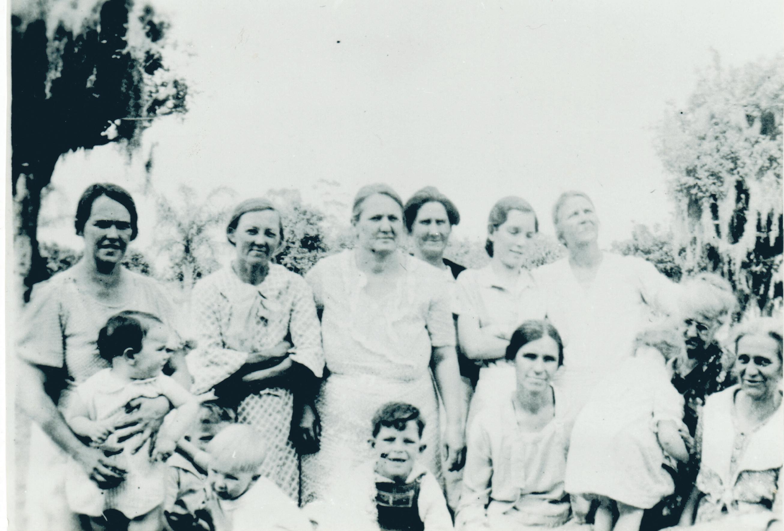 A gathering of local residents posed for this 1935 setting taken at either Mrs. Williams’ home at Black Lake in Ocoee or possibly Mrs. Dillard’s in Tildenville. Back, Madge Robinson, Mrs. Williams, Mrs. Simmons, Mattie Simmons, Rosie Lee Nolen, Mrs. Weir and Mrs. Dillard; front, David Robinson, Carol Simmons, Arthur Paul Nolen, Molly Nolen, Mary Virginia Dillard and Aunt Kate Kilgore. Many of the surnames resound today in Orange County history.